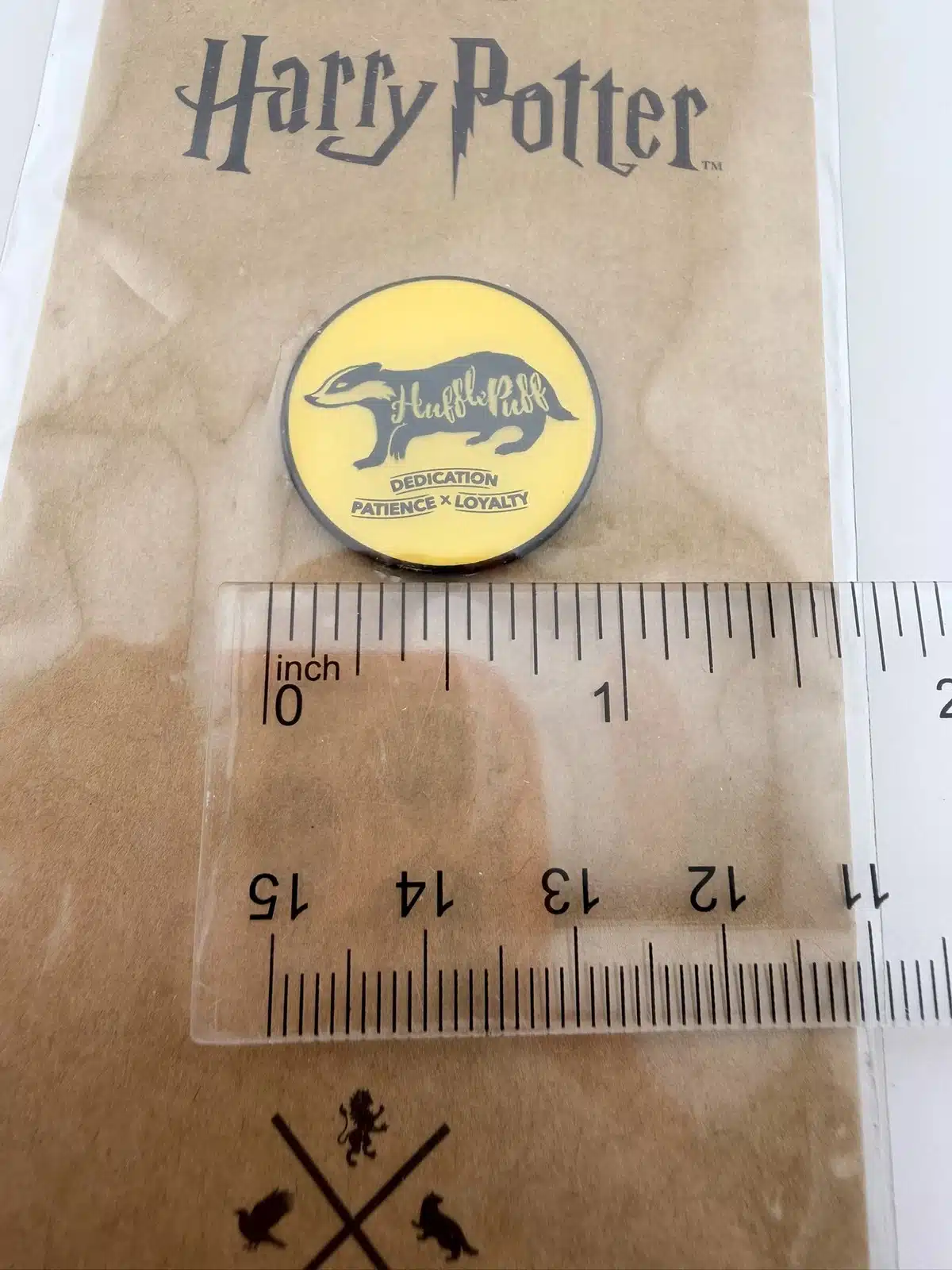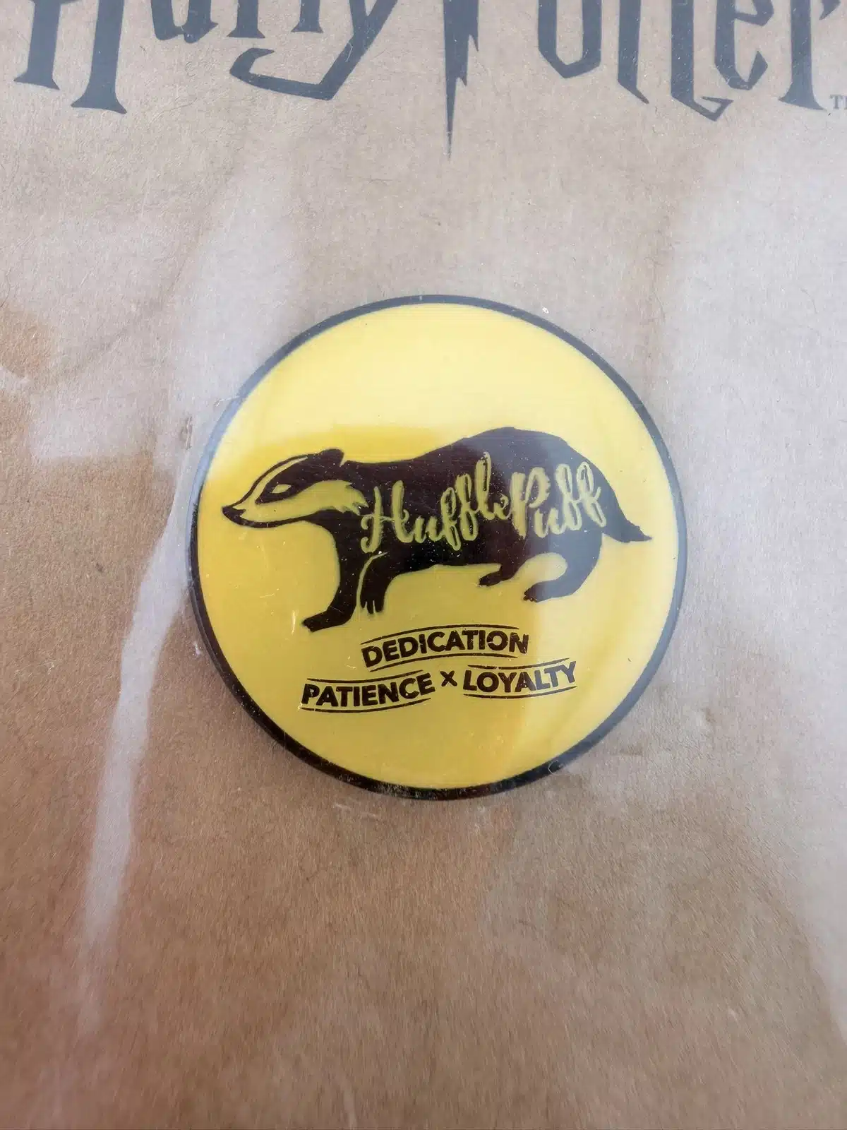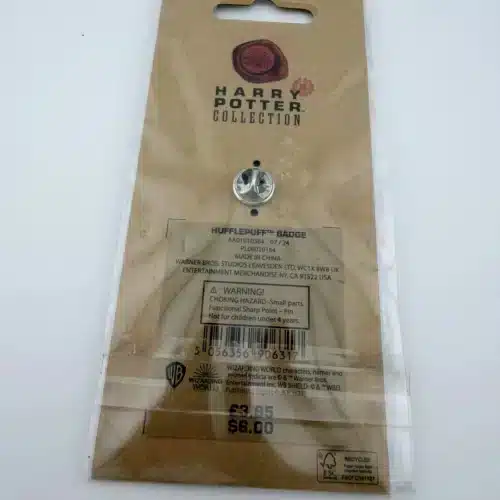 This Hufflepuff badge pin features a striking yellow background with a central badger, symbolizing the house’s values of dedication, patience, and loyalty. The word ‘Hufflepuff’ is prominently displayed on the badger’s, making this pin a vibrant tribute to one of the four houses at Hogwarts School of Witchcraft and Wizardry. Pin measures approximately 1 inch in diameter.