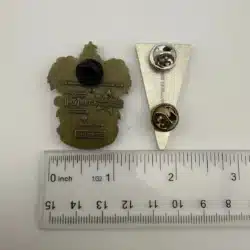 This lot includes a Gryffindor house crest pin, showcasing a bold lion emblem in rich colors of red and gold, symbolizing bravery and courage. Accompanying the crest pin is a Gryffindor pennant flag pin, representing the esteemed Hogwarts School of Witchcraft and Wizardry, where Gryffindor is one of the four founding houses.