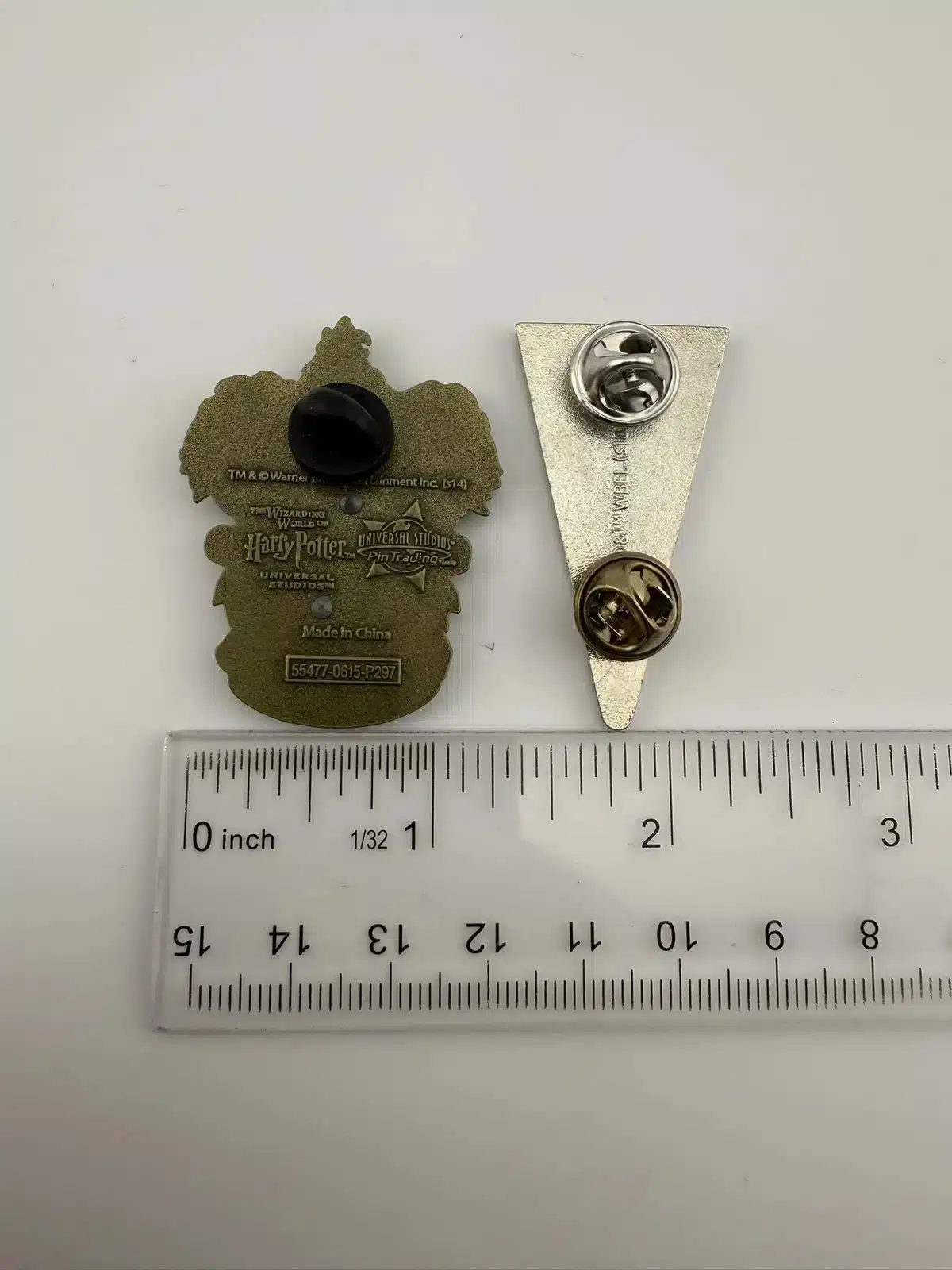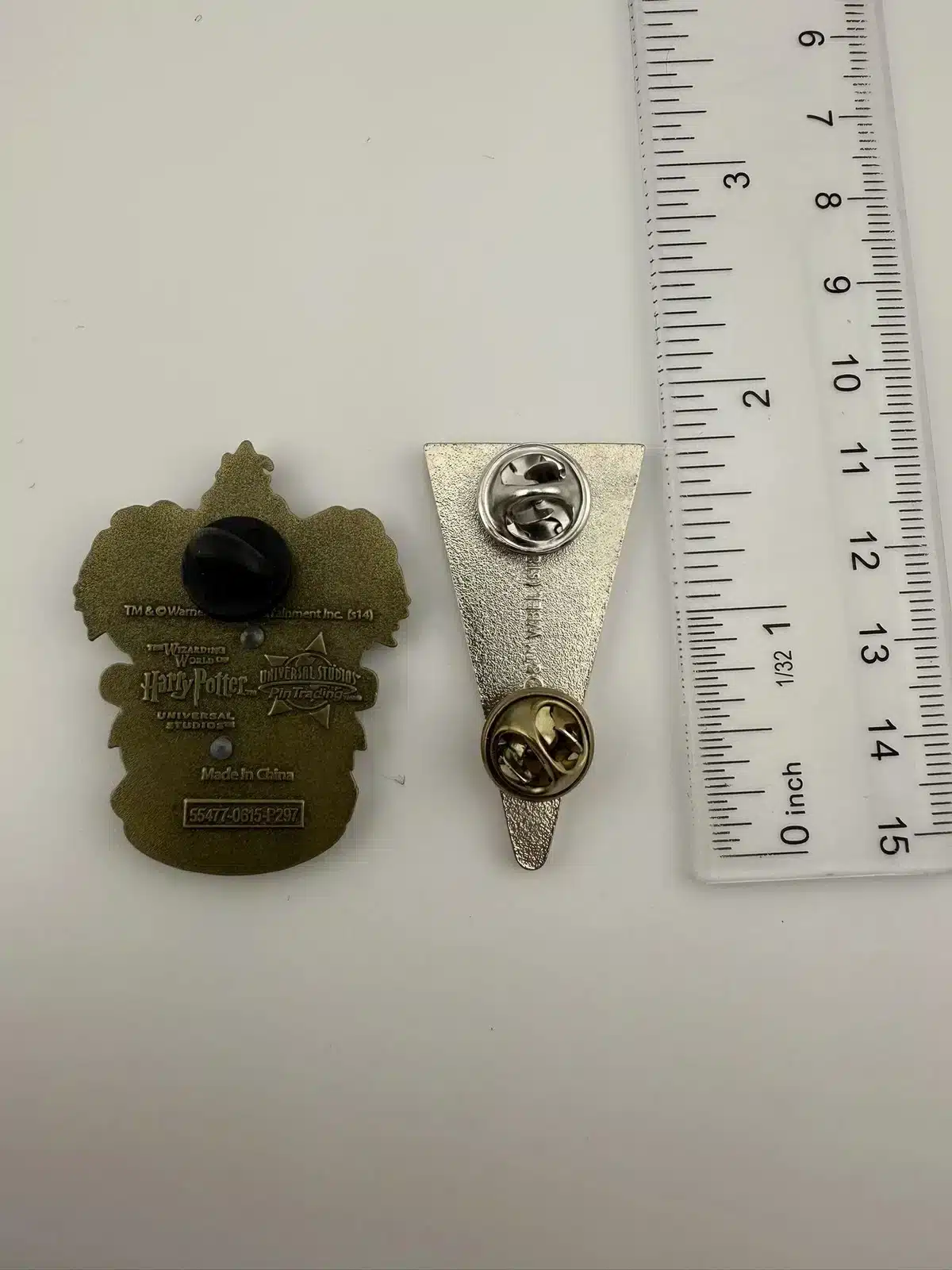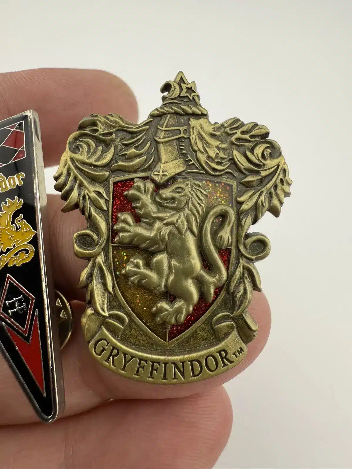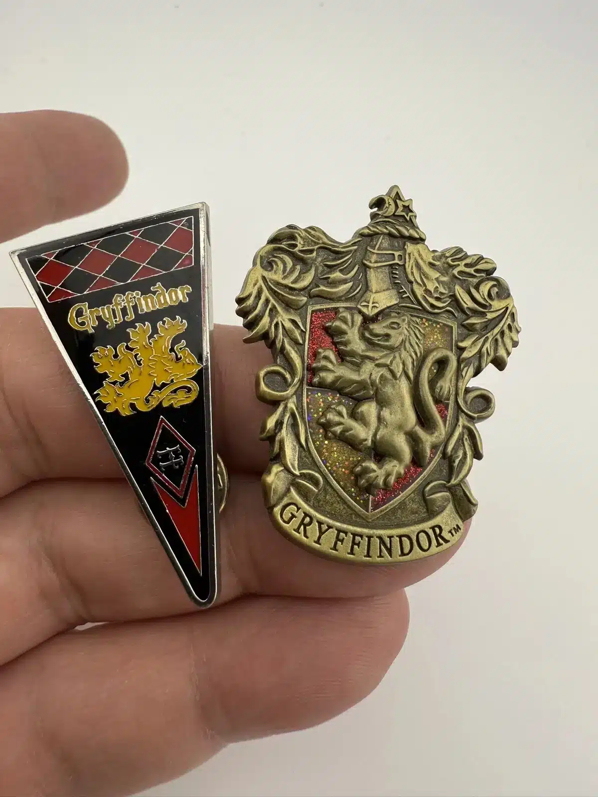 This lot includes a Gryffindor house crest pin, showcasing a bold lion emblem in rich colors of red and gold, symbolizing bravery and courage. Accompanying the crest pin is a Gryffindor pennant flag pin, representing the esteemed Hogwarts School of Witchcraft and Wizardry, where Gryffindor is one of the four founding houses.