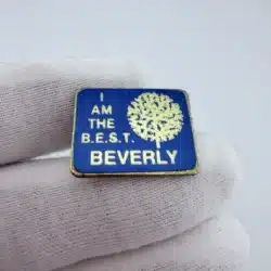 This “I Am The B.E.S.T. Beverly” pin features a blue background with the phrase prominently displayed alongside a graphic of a tree. The simple layout and bold lettering give the design a clean corporate recognition style.