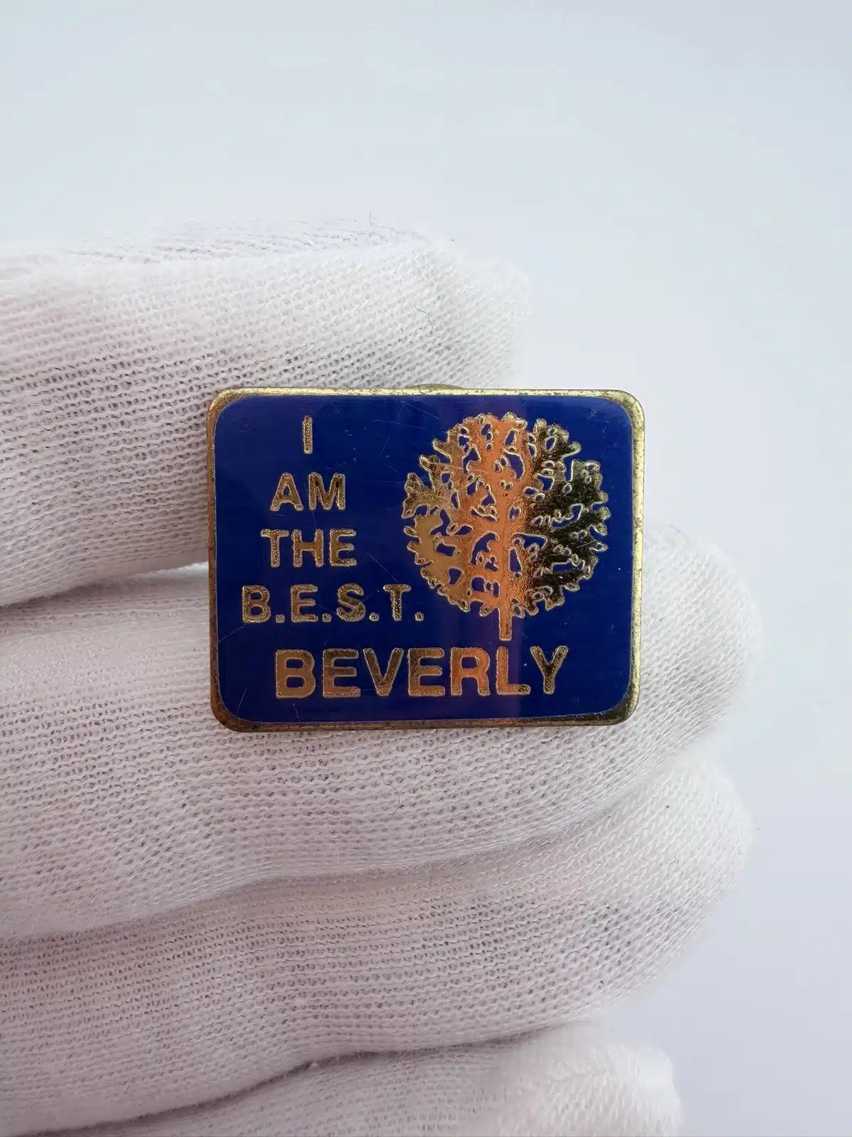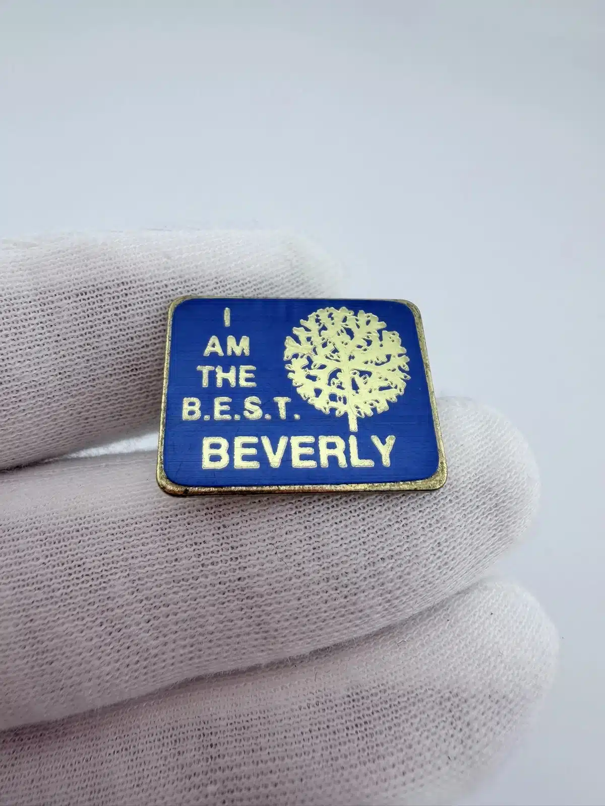 This “I Am The B.E.S.T. Beverly” pin features a blue background with the phrase prominently displayed alongside a graphic of a tree. The simple layout and bold lettering give the design a clean corporate recognition style.