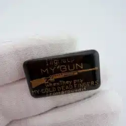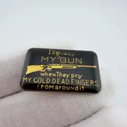 This rectangular pin features a rifle centered within the design, surrounded by the phrase I Will Give Up My Gun When They Pry My Cold Dead Fingers From Around It. The text is arranged across the surface, creating a bold statement-style layout with the firearm imagery integrated into the wording.