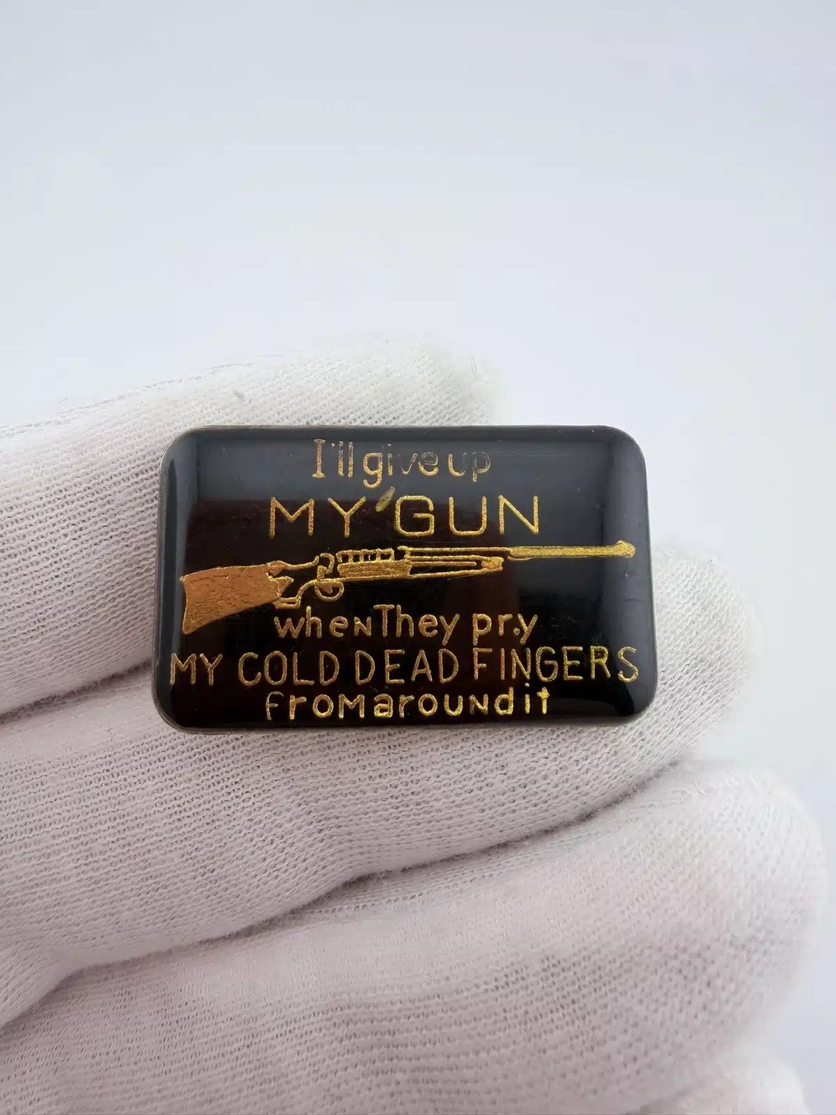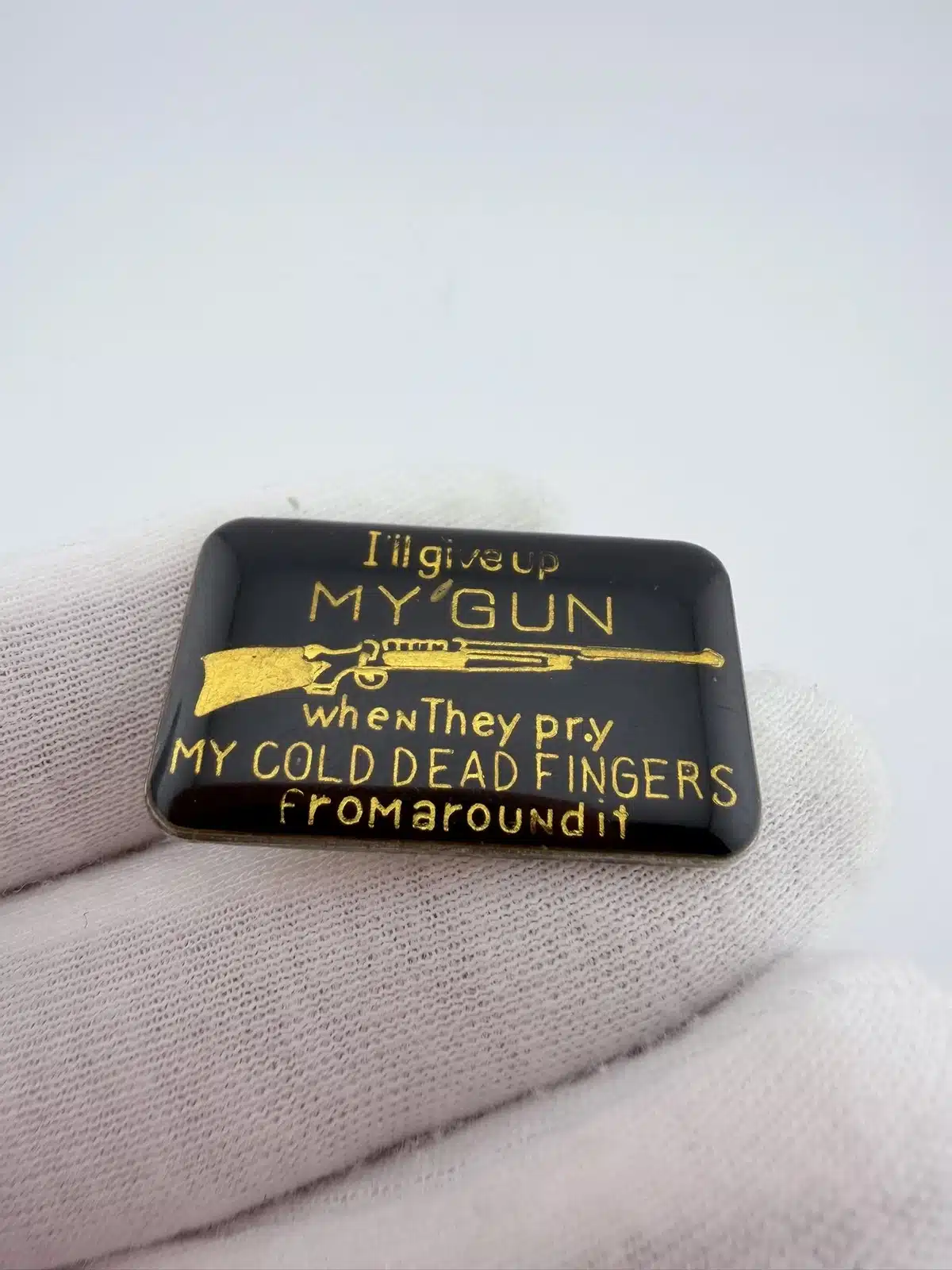 This rectangular pin features a rifle centered within the design, surrounded by the phrase I Will Give Up My Gun When They Pry My Cold Dead Fingers From Around It. The text is arranged across the surface, creating a bold statement-style layout with the firearm imagery integrated into the wording.
