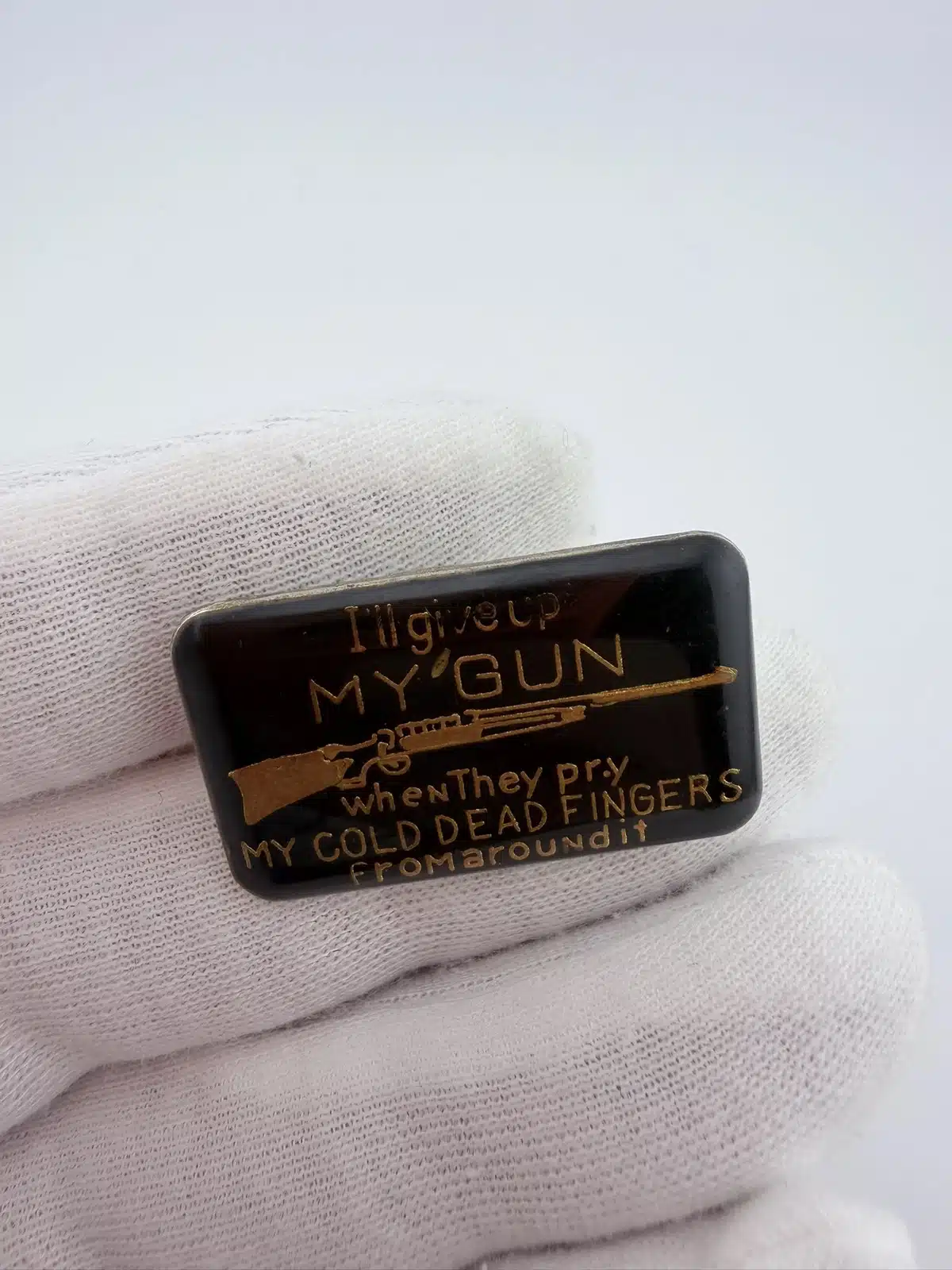This phrase has been widely used in American gun rights discourse as a statement of opposition to firearm surrender or regulation. Pin measures approximately 1 1/4 inches in width by 3/4 inch in height.
