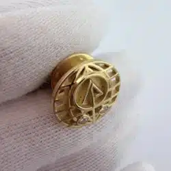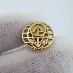 This 20 year employee service pin features a globe with a stylized tree at its center, symbolizing the International Paper Company’s commitment to sustainability and global reach. The design is complemented by two stones positioned near the bottom, enhancing its elegance while showcasing the company’s logo. This pin is just over 1/2 inch in diameter.