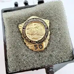 This pin commemorates 50 years of membership at the International Association of Bridge, Structural, and Ornamental Iron Workers Union, featuring a design that symbolizes the strength and craftsmanship of ironwork. The intricate detailing reflects the union’s long-standing commitment to excellence in the construction industry.