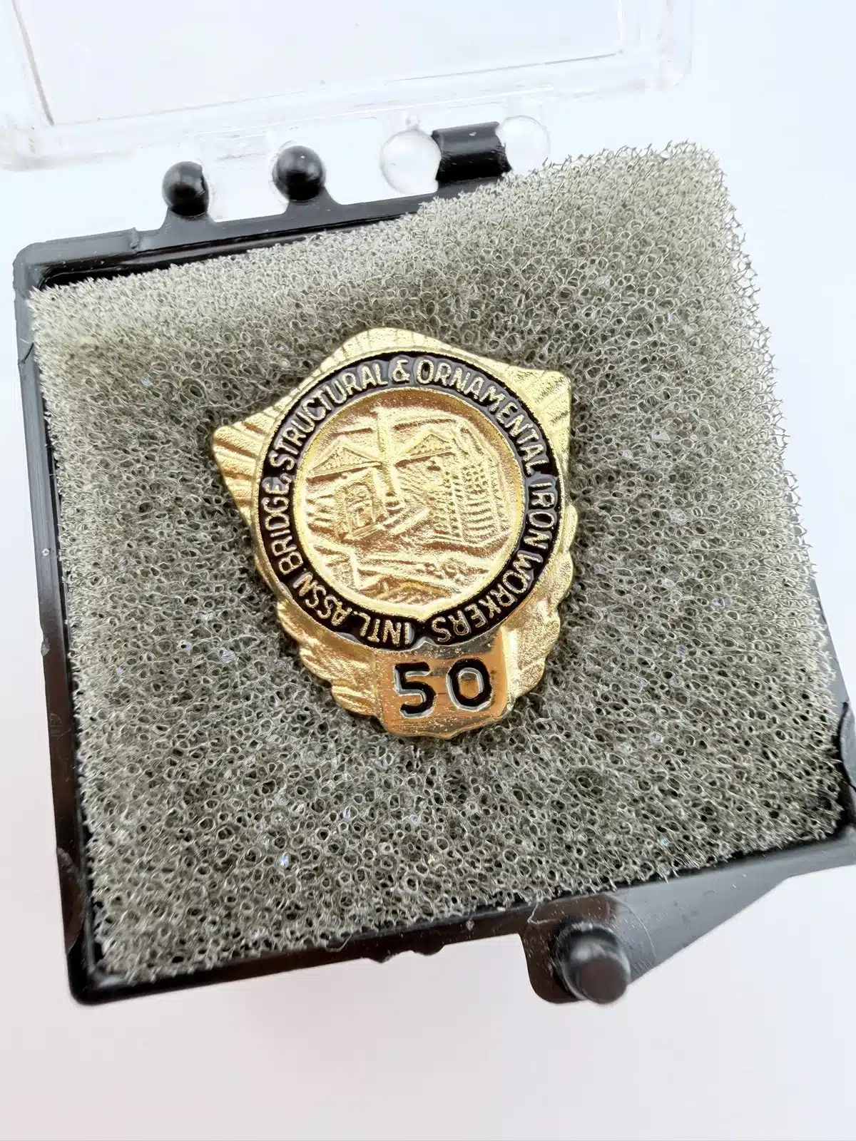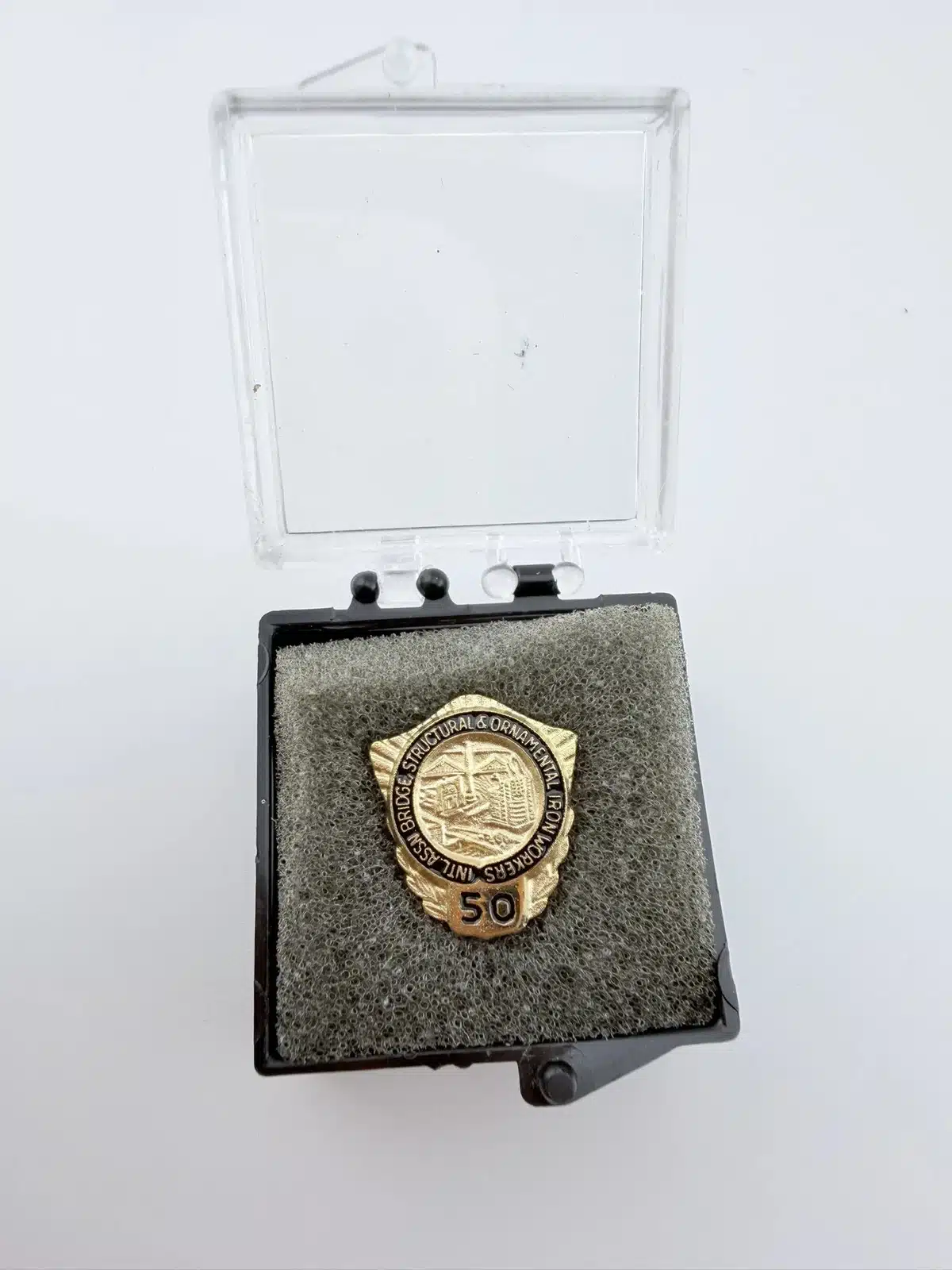 This pin commemorates 50 years of membership at the International Association of Bridge, Structural, and Ornamental Iron Workers Union, featuring a design that symbolizes the strength and craftsmanship of ironwork. The intricate detailing reflects the union’s long-standing commitment to excellence in the construction industry.