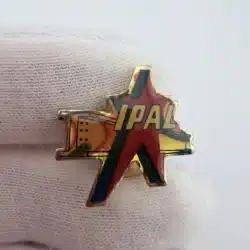 Measuring approximately 3/4 inch in width by 3/4 inch in height, this likely vintage IPAL pin features a bold red star layered over a structural beam motif. The large letters “IPAL” appear prominently across the star, reinforcing the identity of the Ironworkers Political Action League.