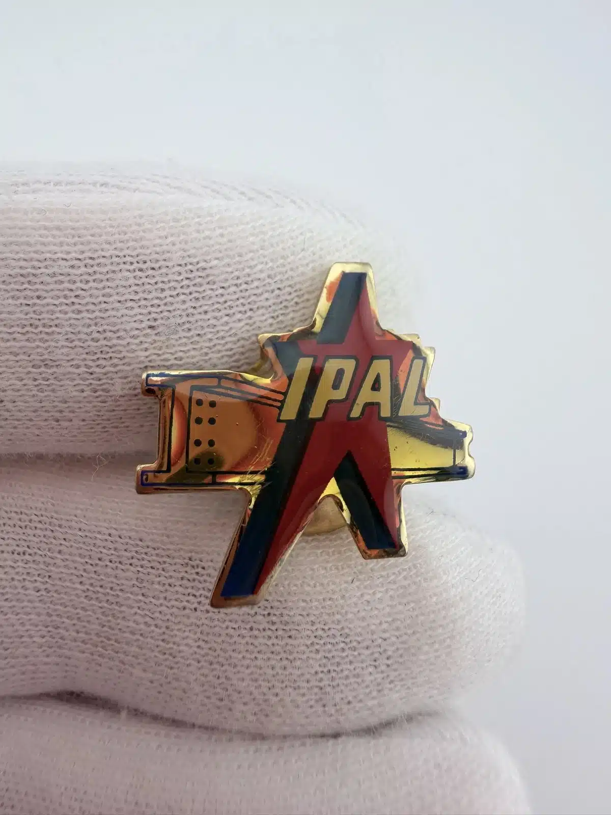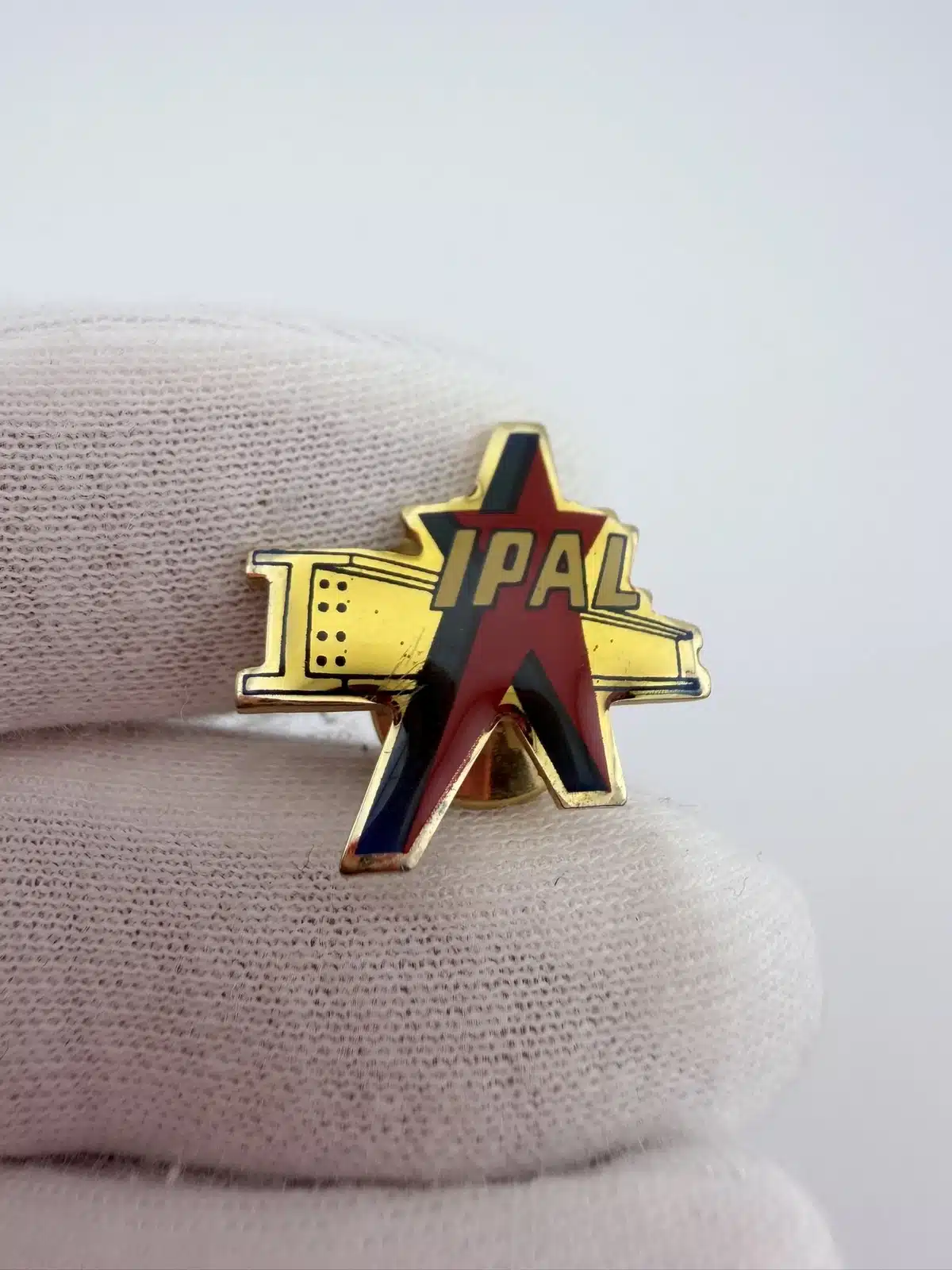 Measuring approximately 3/4 inch in width by 3/4 inch in height, this likely vintage IPAL pin features a bold red star layered over a structural beam motif. The large letters “IPAL” appear prominently across the star, reinforcing the identity of the Ironworkers Political Action League.