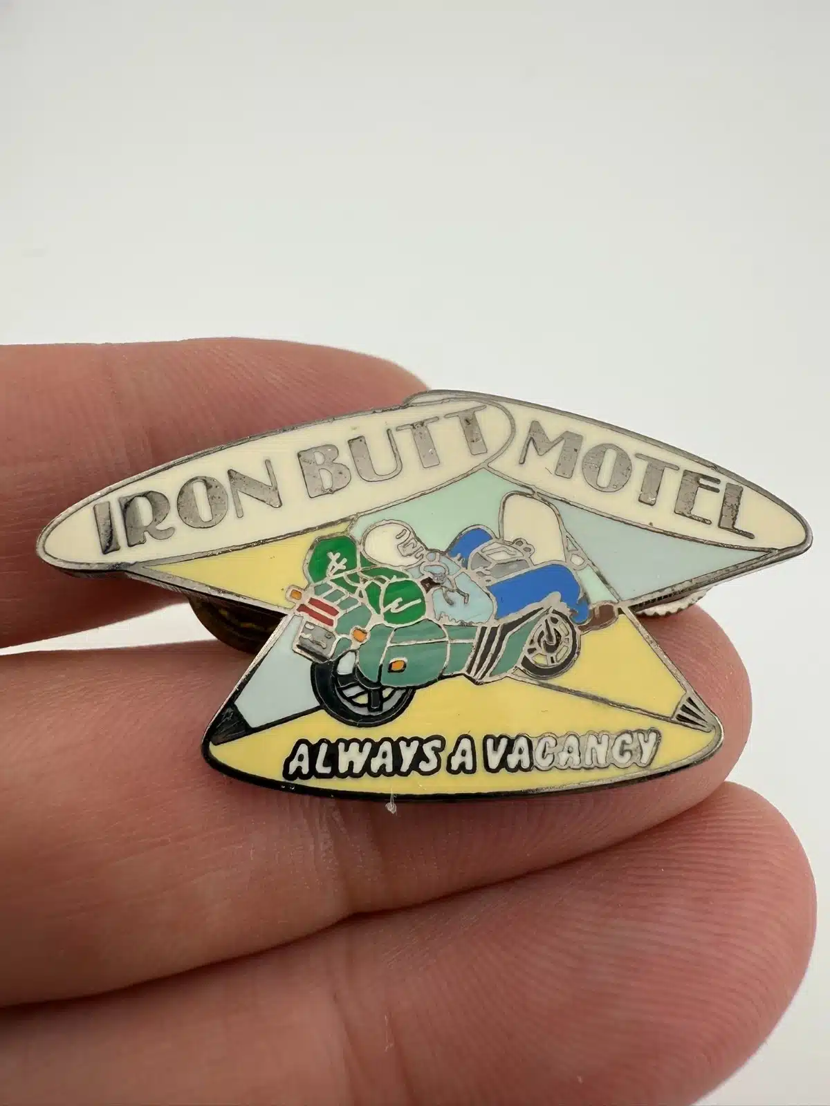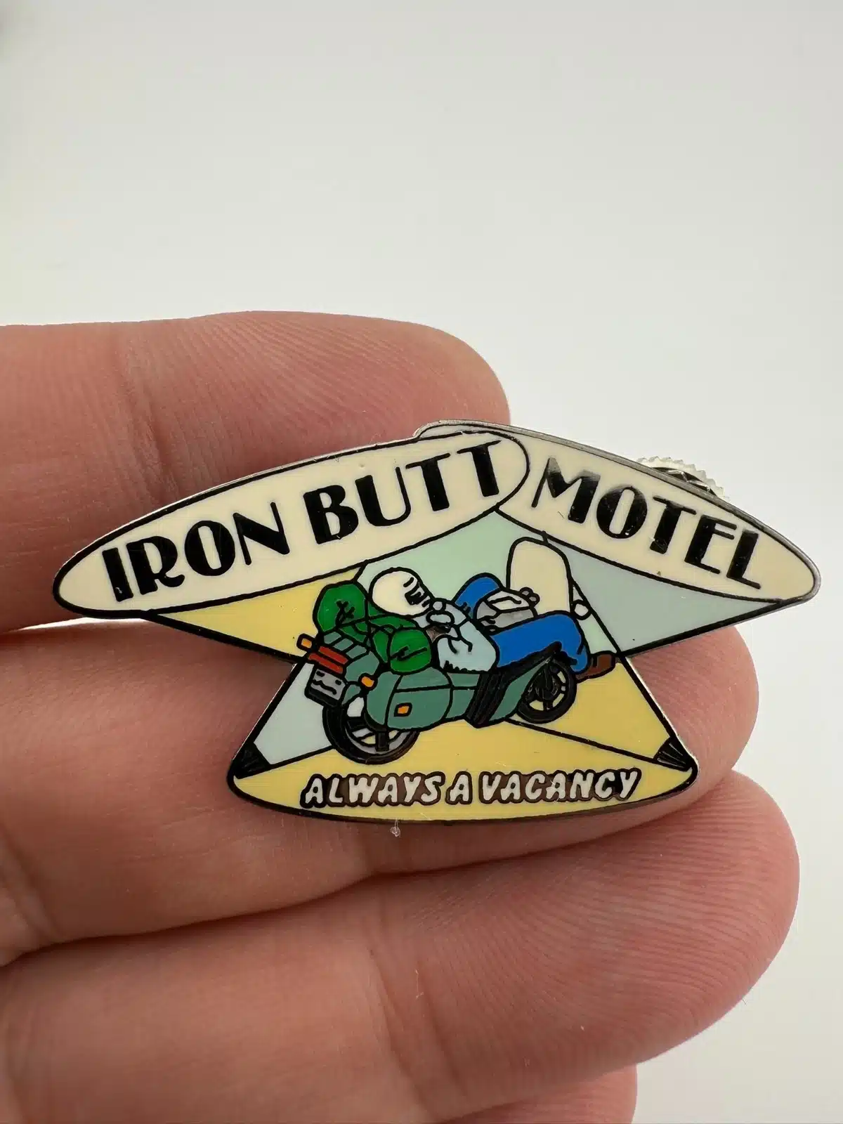 Iron Butt Motel Motorcycle Pin – Always a Vacancy – Dual Screwback