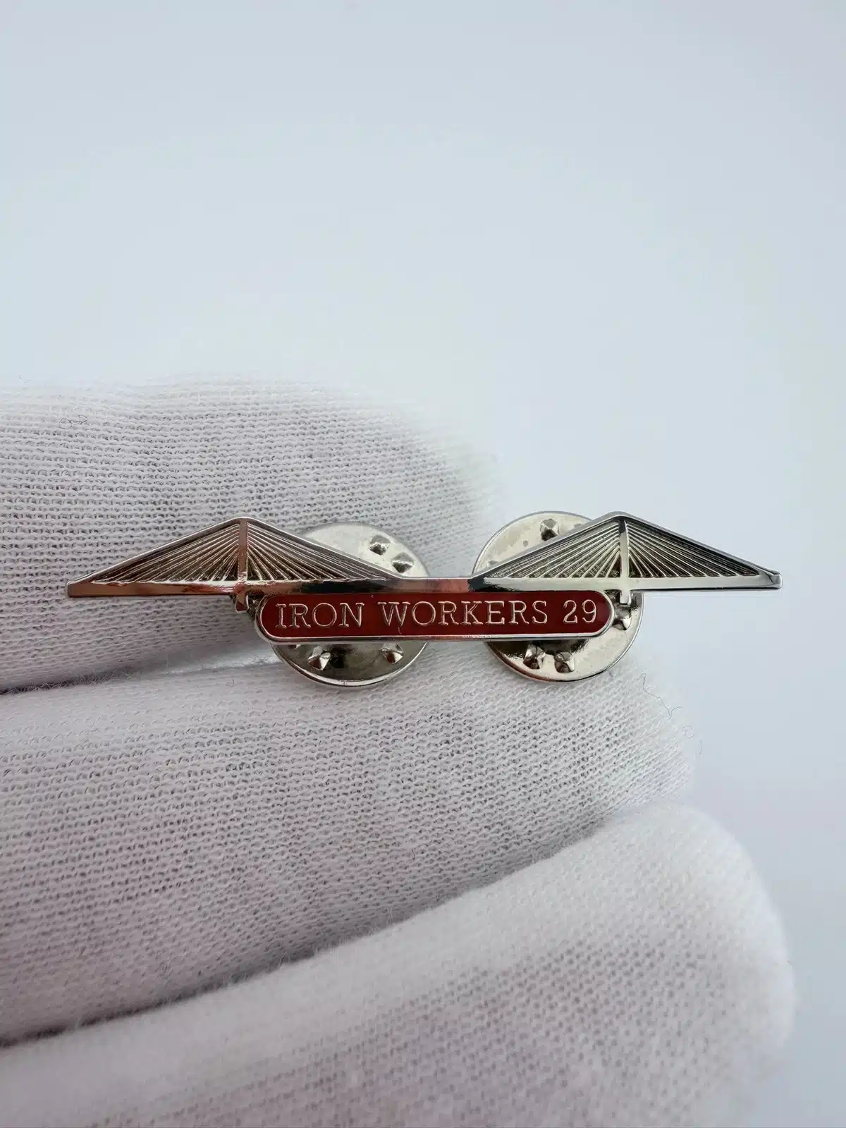 A banner below the bridge reads “Iron Workers 29,” identifying the local union affiliation. Iron Workers Local 29 is part of the International Association of Bridge, Structural, Ornamental and Reinforcing Iron Workers, representing union ironworkers in the Portland, Oregon region. The pin is finished with dual rear clasps for added stability.
