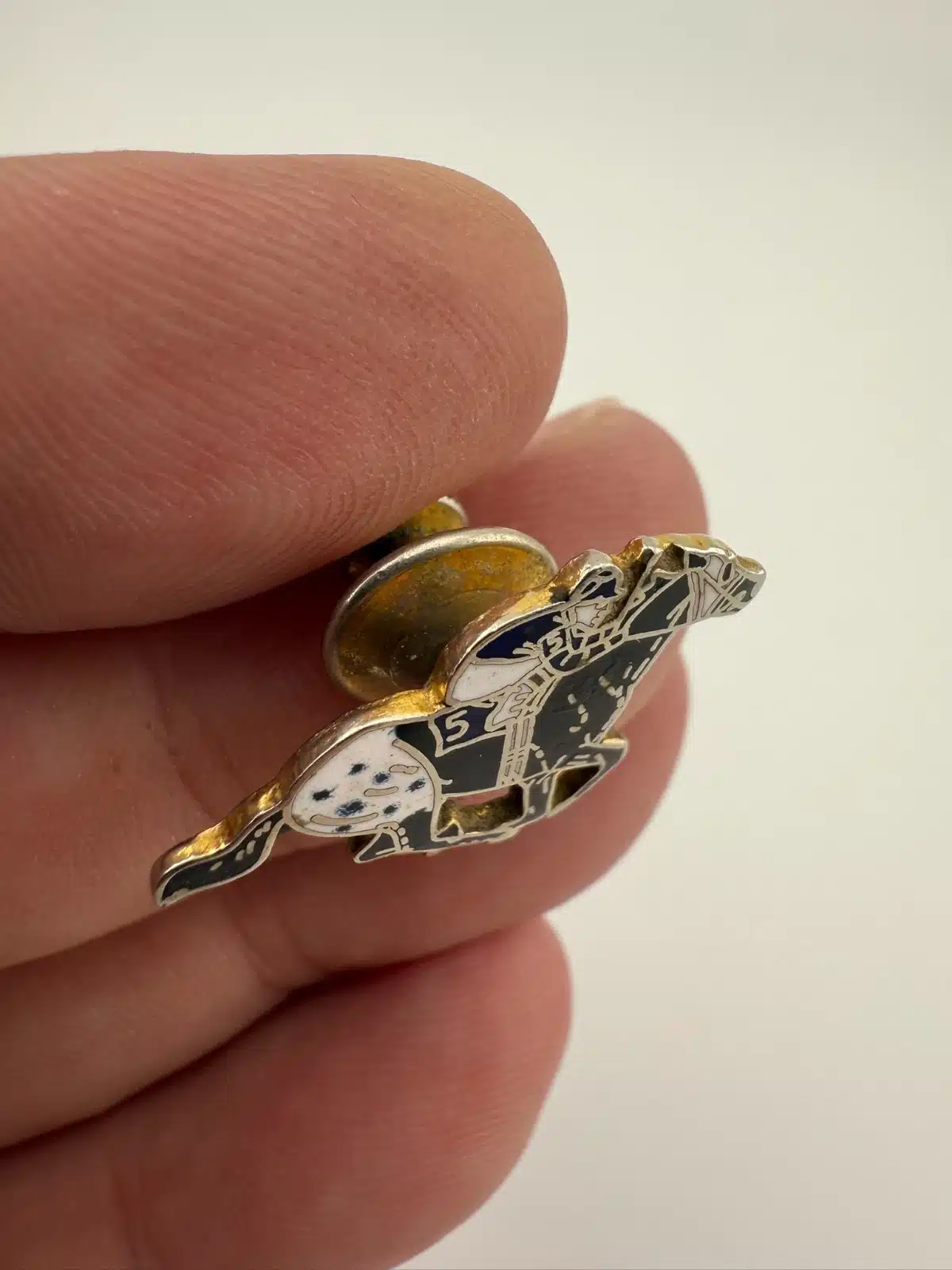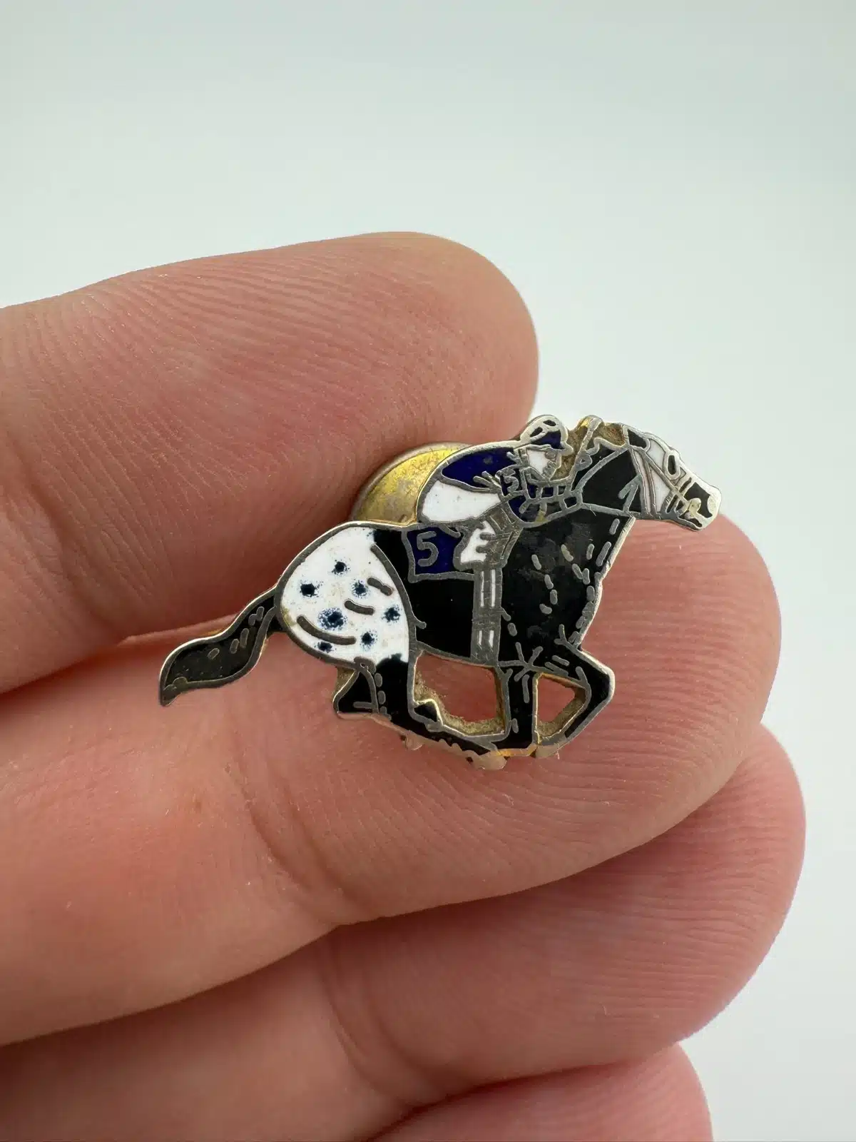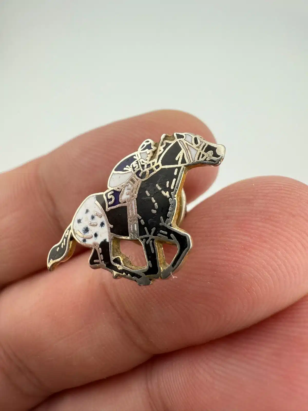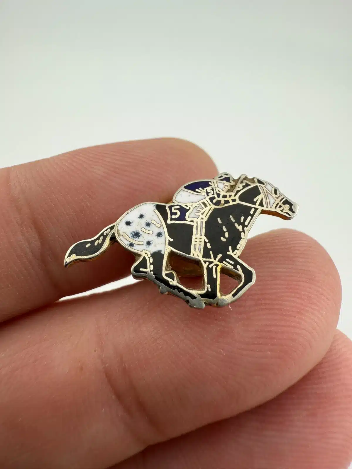 Depicting a racing scene, this pin shows a jockey riding a number “5” horse in motion. The composition captures the forward movement of the horse with the rider positioned low over the saddle in a typical racing posture.