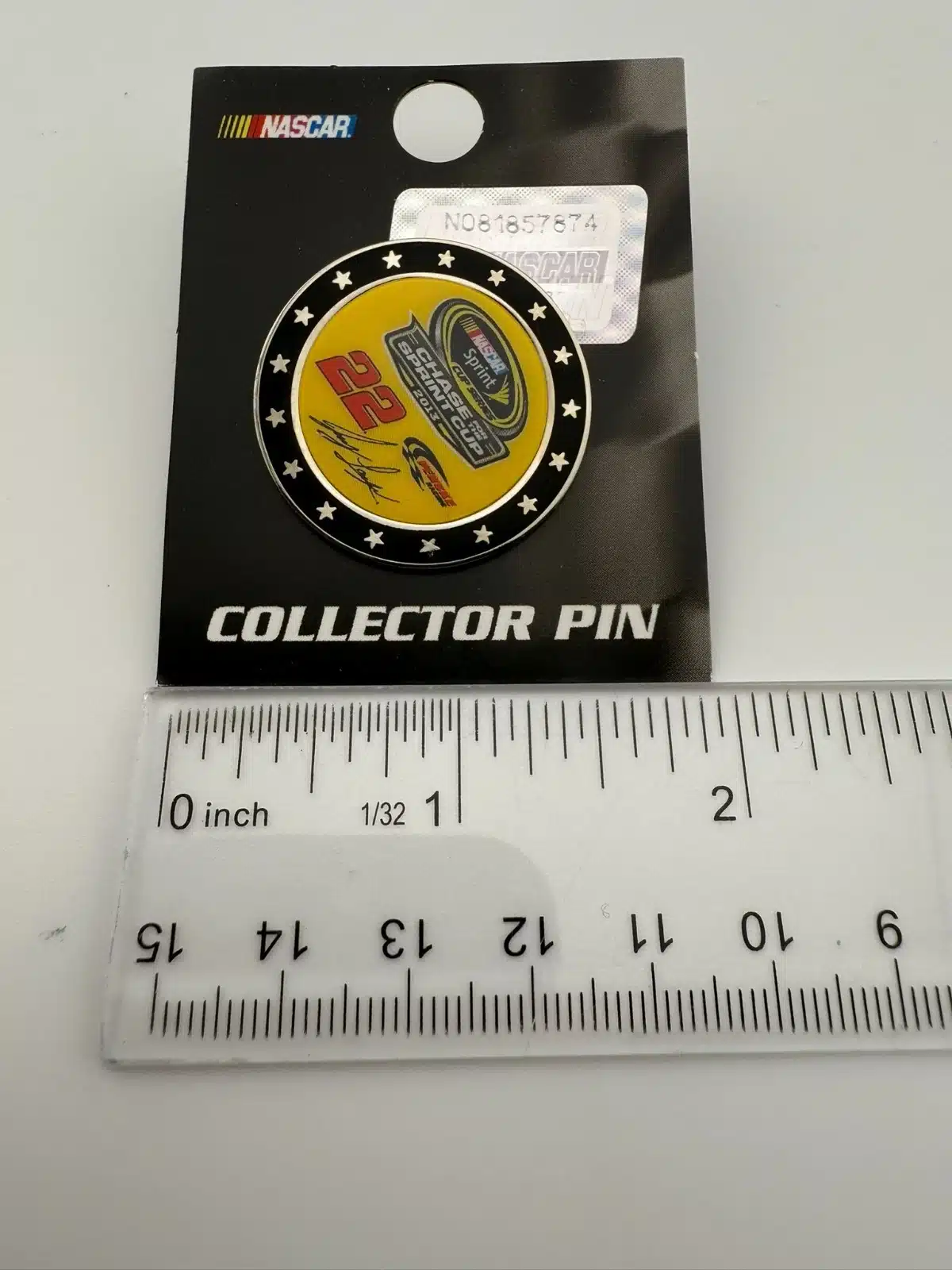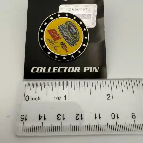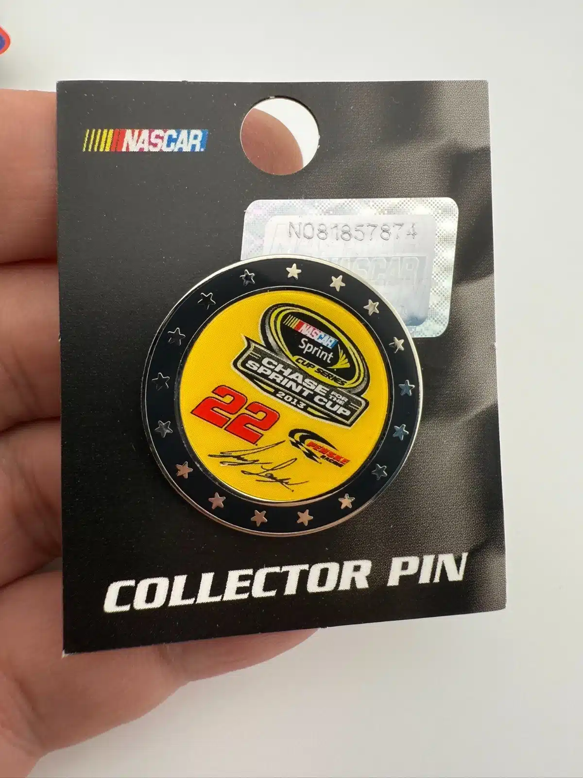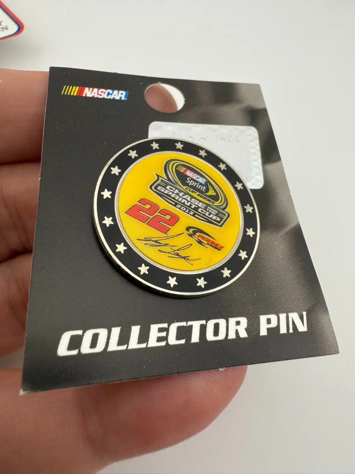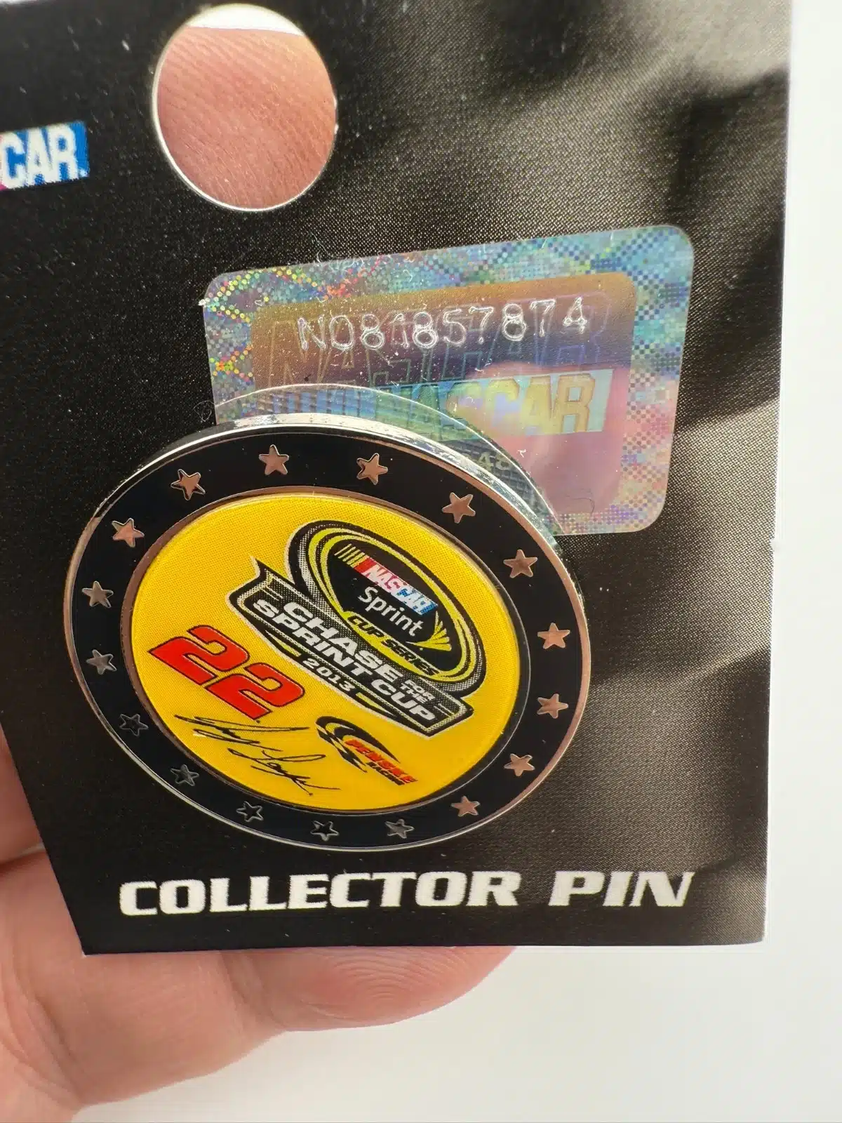 Joey Logano drove the No. 22 car for Team Penske during the 2013 NASCAR Sprint Cup Series season, with the Chase for the Sprint Cup serving as the playoff format to determine that year’s champion. Pin measures just over 1 inch in diameter.