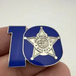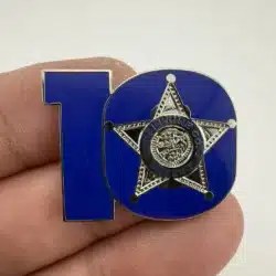 This collectible pin features a distinctive design shaped like the number ’10’, prominently incorporating a Sheriff’s badge in place of the the hole in the number ‘0’. The pin represents Josephine County, Oregon, highlighting the region’s law enforcement history and community pride. Unsure what the #10 is in reference to.