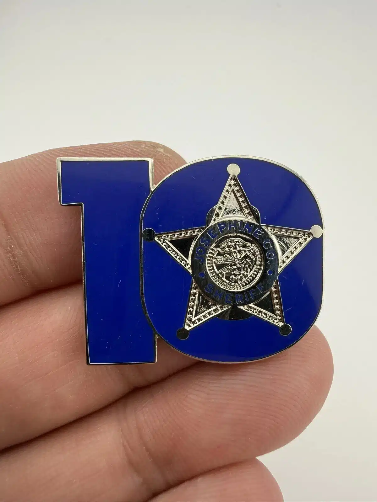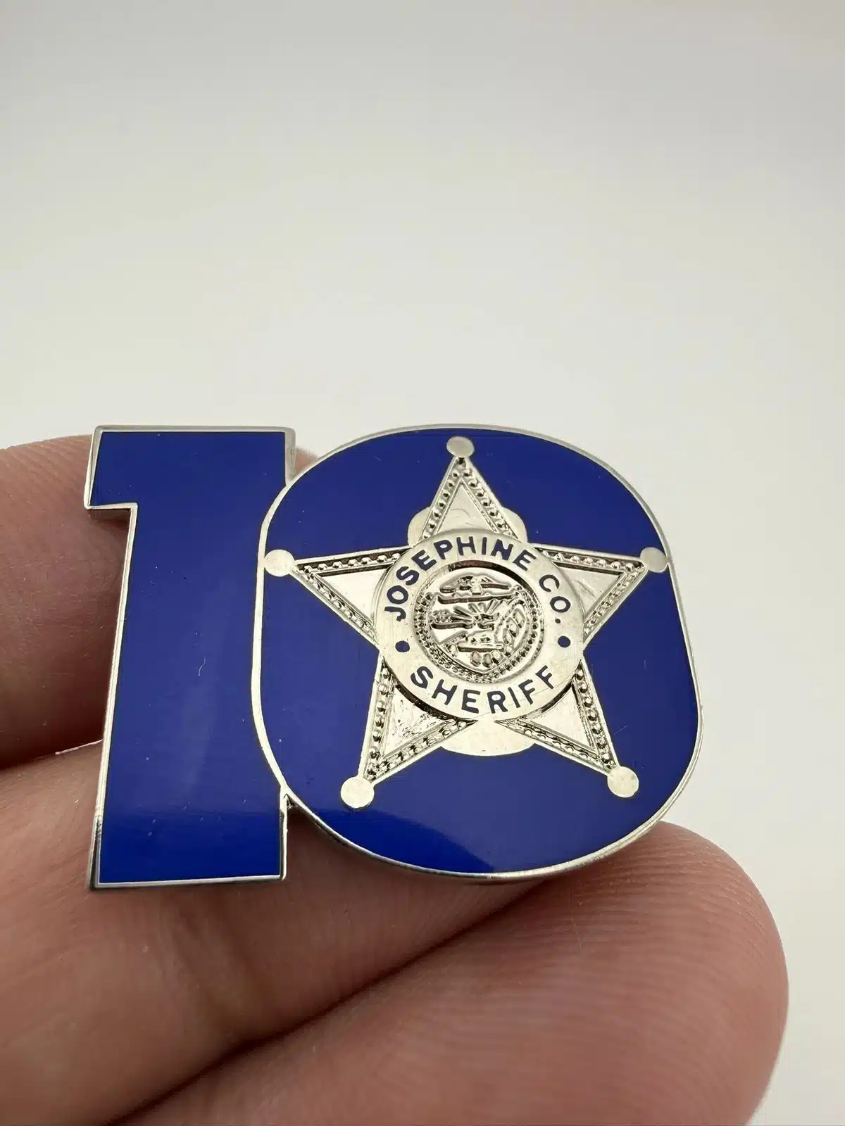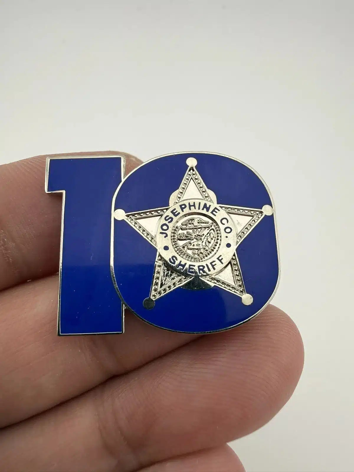 This collectible pin features a distinctive design shaped like the number ’10’, prominently incorporating a Sheriff’s badge in place of the the hole in the number ‘0’. The pin represents Josephine County, Oregon, highlighting the region’s law enforcement history and community pride. Unsure what the #10 is in reference to.