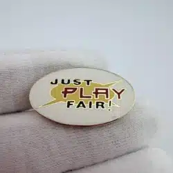 JUST PLAY FAIR! lapel pin features an oval design with the phrase “Just Play Fair!” displayed across the center, with the word “Play” highlighted in red while the rest of the text appears in a contrasting black color. The bold lettering emphasizes the simple message promoting fairness and good sportsmanship.
