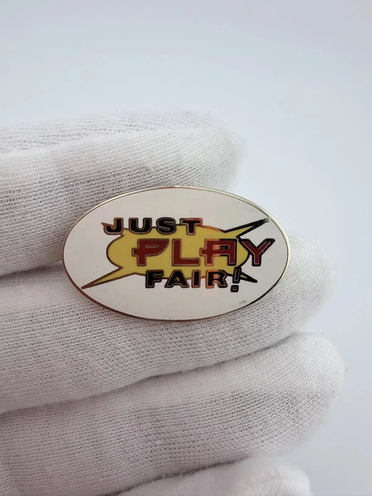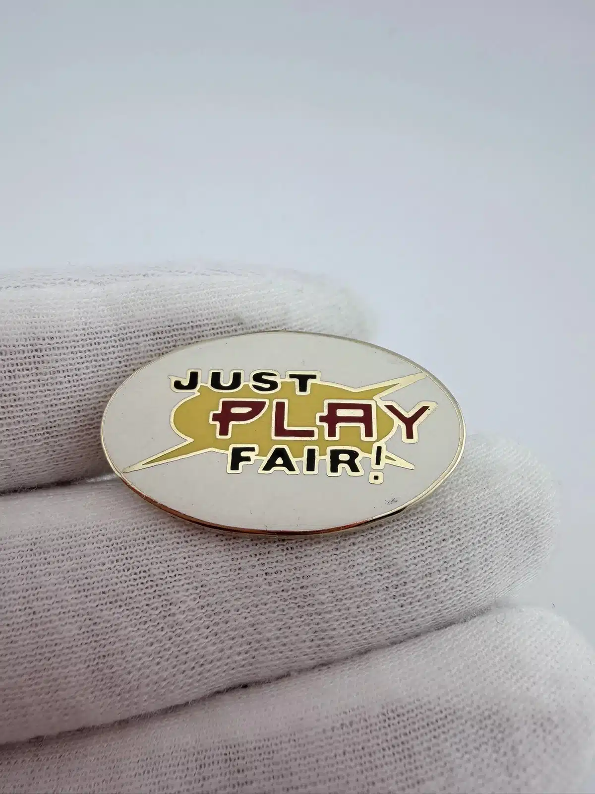 JUST PLAY FAIR! lapel pin features an oval design with the phrase “Just Play Fair!” displayed across the center, with the word “Play” highlighted in red while the rest of the text appears in a contrasting black color. The bold lettering emphasizes the simple message promoting fairness and good sportsmanship.