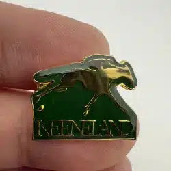 This lapel pin features the Keeneland logo in a striking green and gold tone, representing the renowned horse racing track in Lexington, Kentucky which was established in 1936.