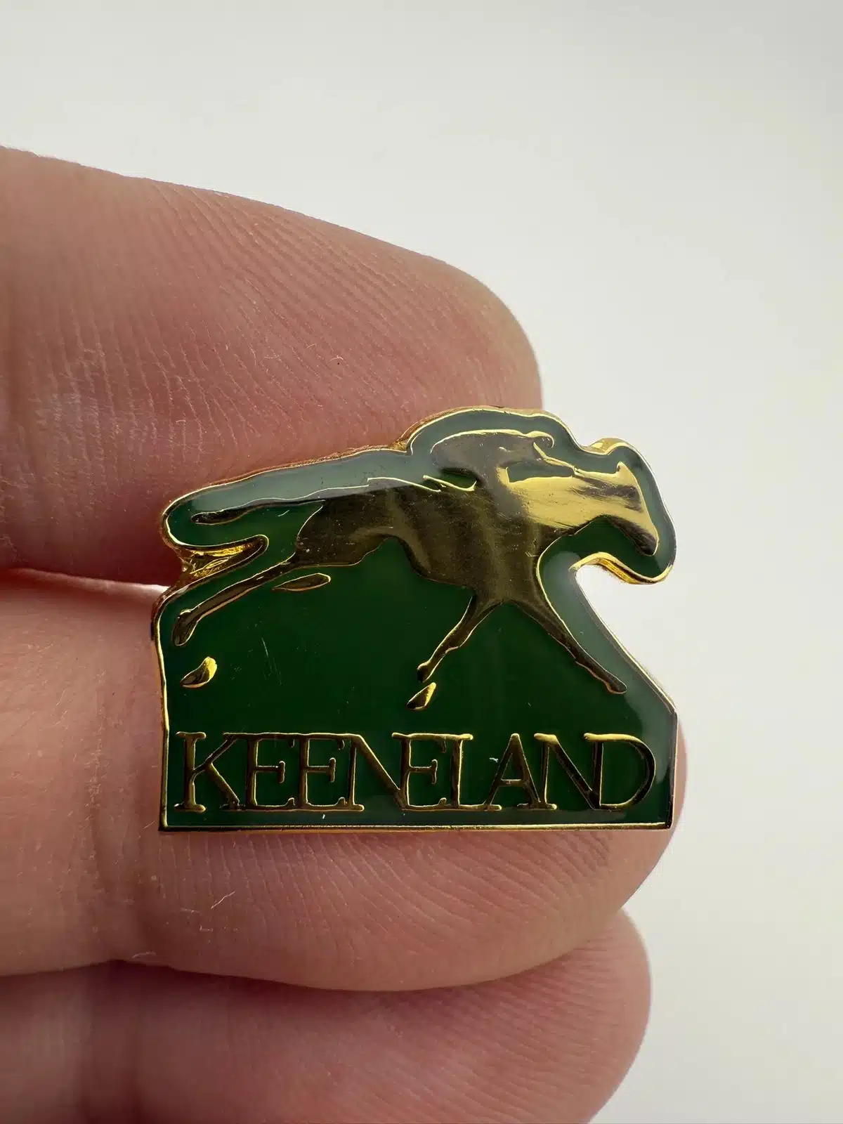 This lapel pin features the Keeneland logo in a striking green and gold tone, representing the renowned horse racing track in Lexington, Kentucky which was established in 1936.