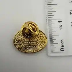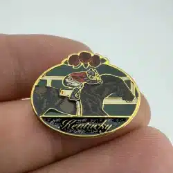 This lapel pin features a beautifully detailed depiction of a horse and jockey, symbolizing the rich tradition of horse racing in Kentucky. Surrounding the central motif are elegant roses, which are often associated with the Kentucky Derby, adding a touch of floral artistry to this collectible piece.