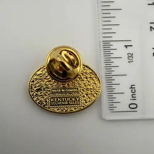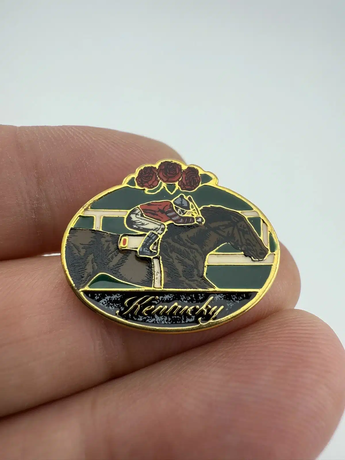 This lapel pin features a beautifully detailed depiction of a horse and jockey, symbolizing the rich tradition of horse racing in Kentucky. Surrounding the central motif are elegant roses, which are often associated with the Kentucky Derby, adding a touch of floral artistry to this collectible piece.