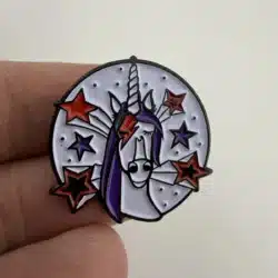 This lapel pin features Bowiecorn, the recognizable KEXP mascot, depicted as a whimsical unicorn with a bold lightning bolt across one eye and shooting stars surrounding the design. The imagery reflects the creative spirit of KEXP 90.3 FM, an influential Seattle-based radio station celebrated for its eclectic music programming and strong support of the arts.