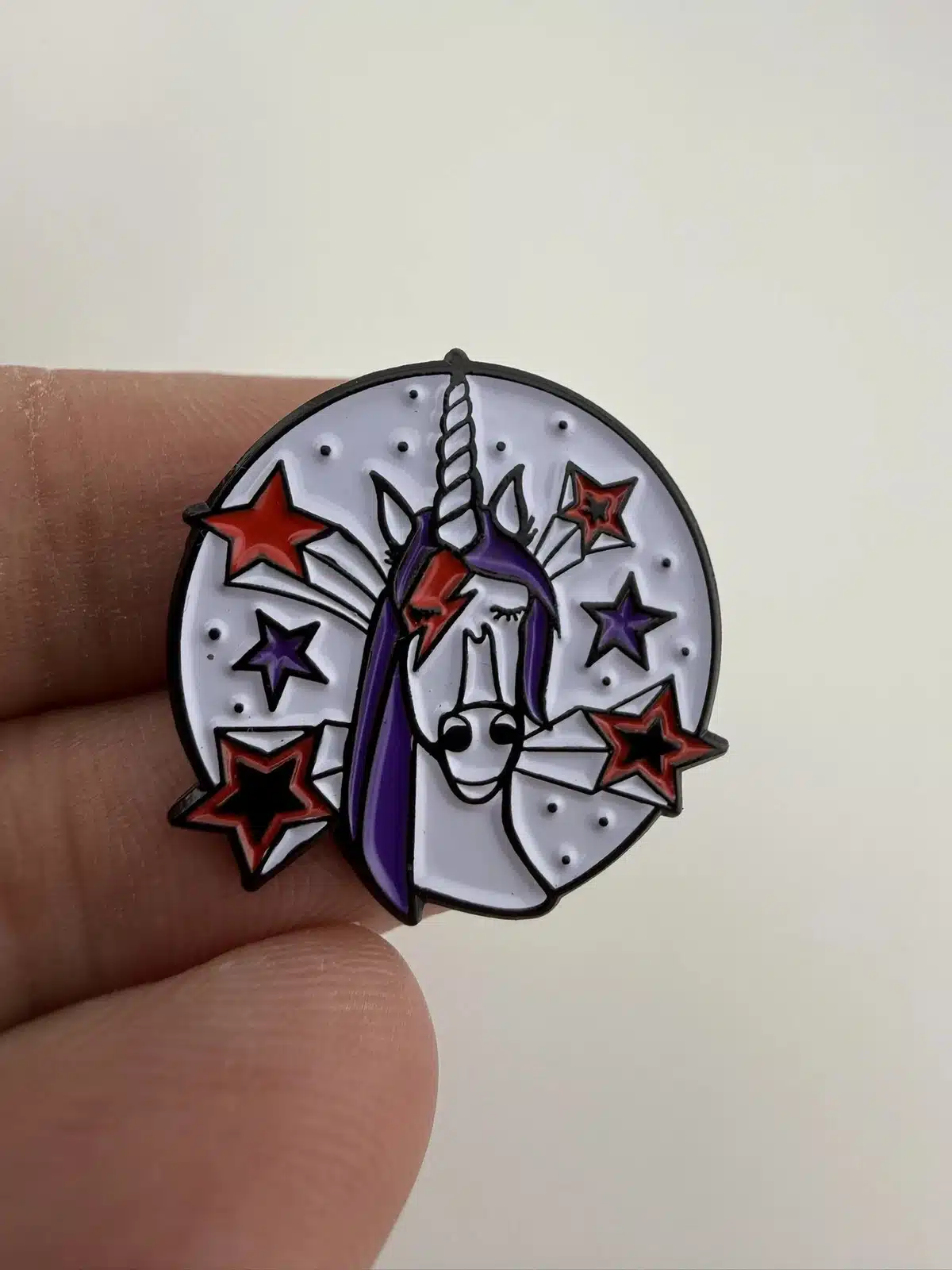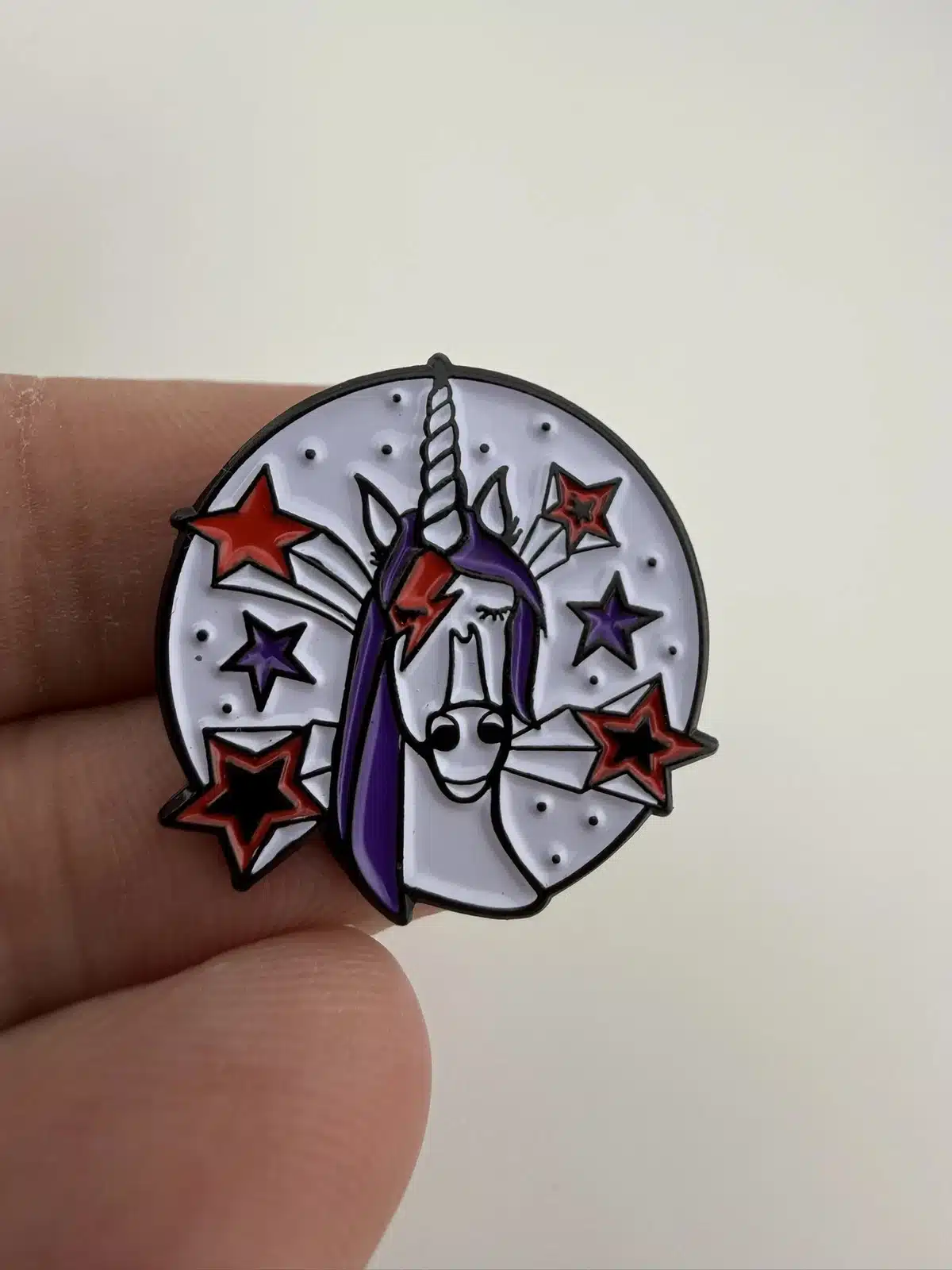 This lapel pin features Bowiecorn, the recognizable KEXP mascot, depicted as a whimsical unicorn with a bold lightning bolt across one eye and shooting stars surrounding the design. The imagery reflects the creative spirit of KEXP 90.3 FM, an influential Seattle-based radio station celebrated for its eclectic music programming and strong support of the arts.