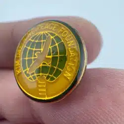 This pin features the logo of the Kim Dae Jung Peace Foundation, showcasing a globe and dove design that symbolizes peace and international cooperation.