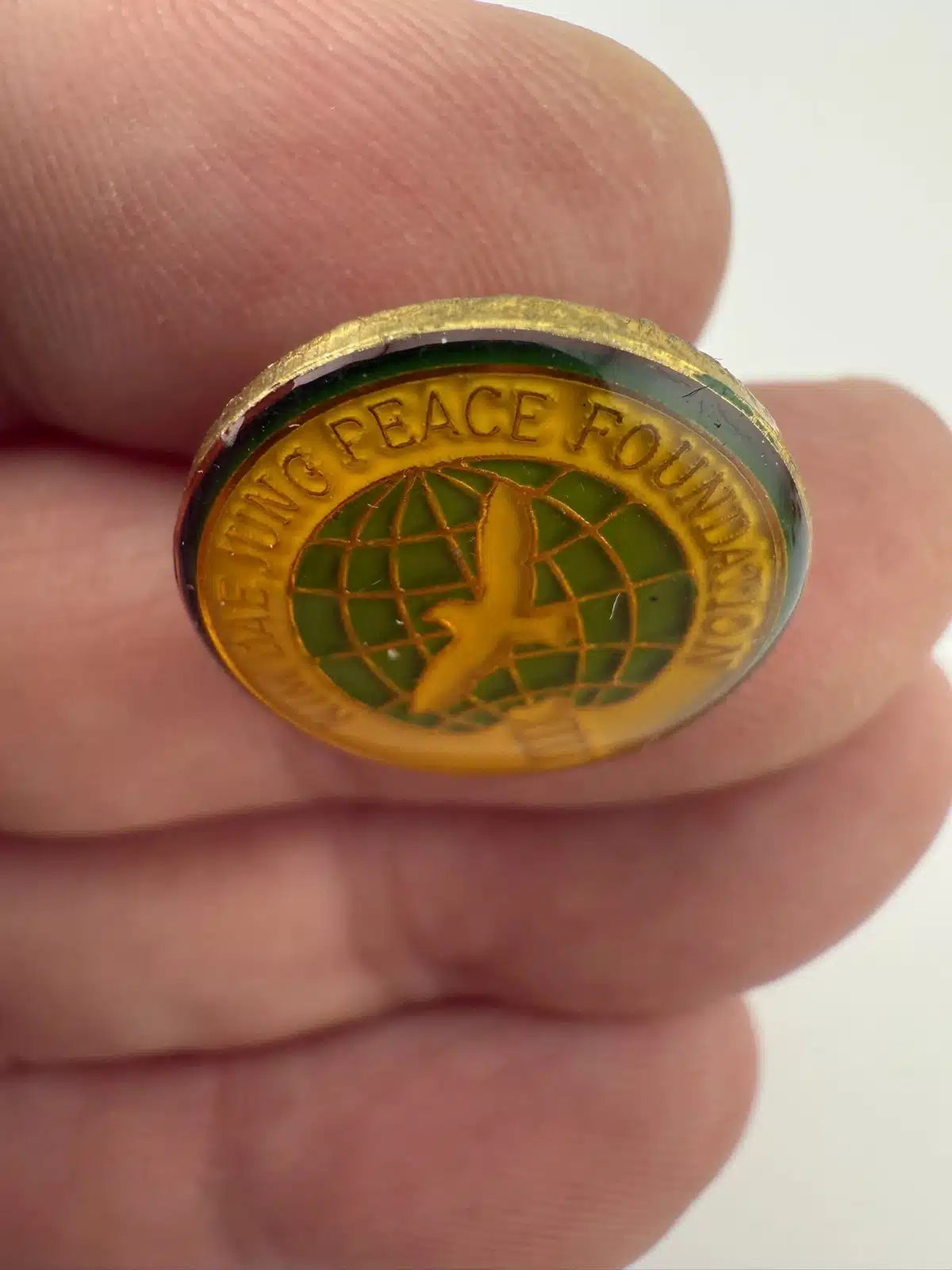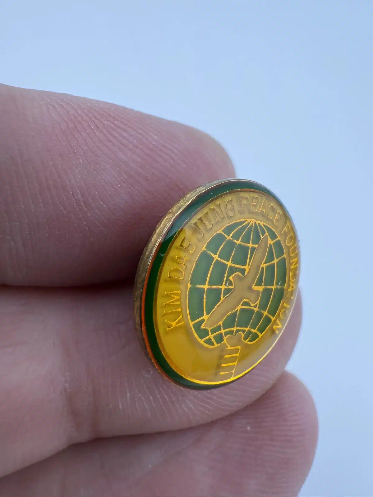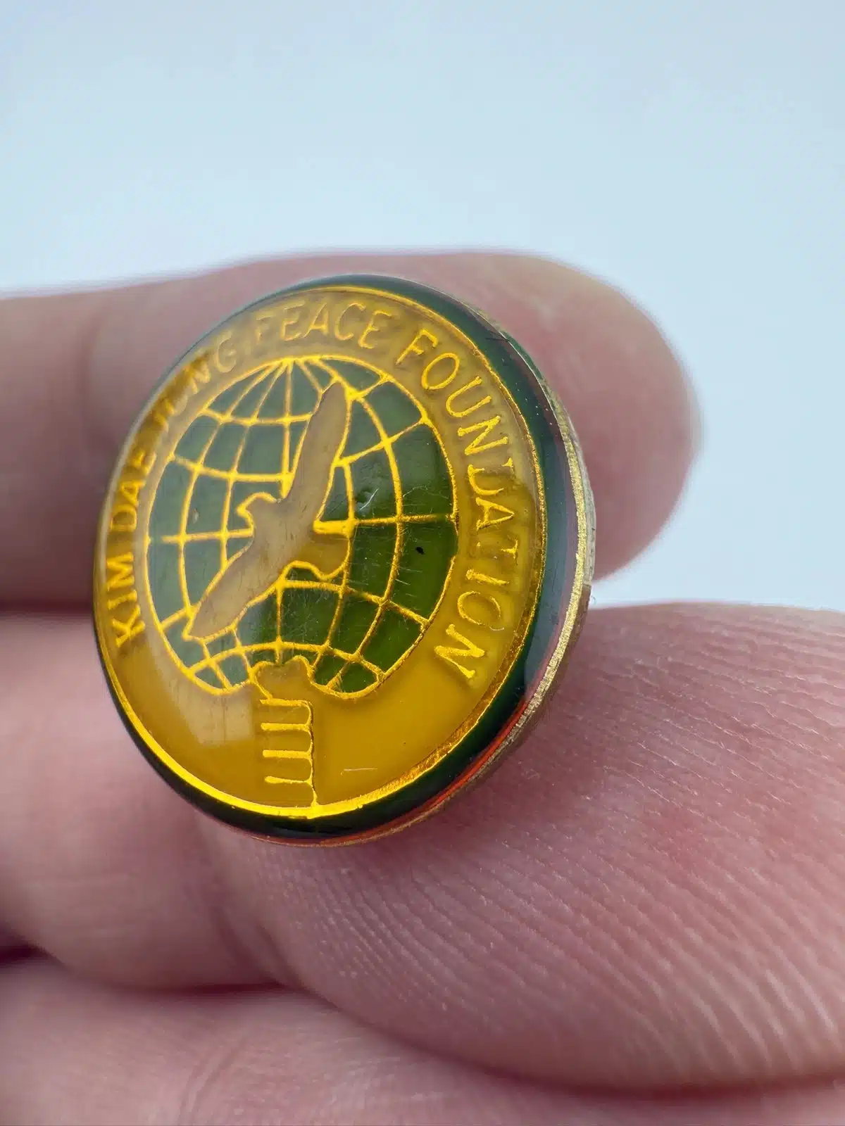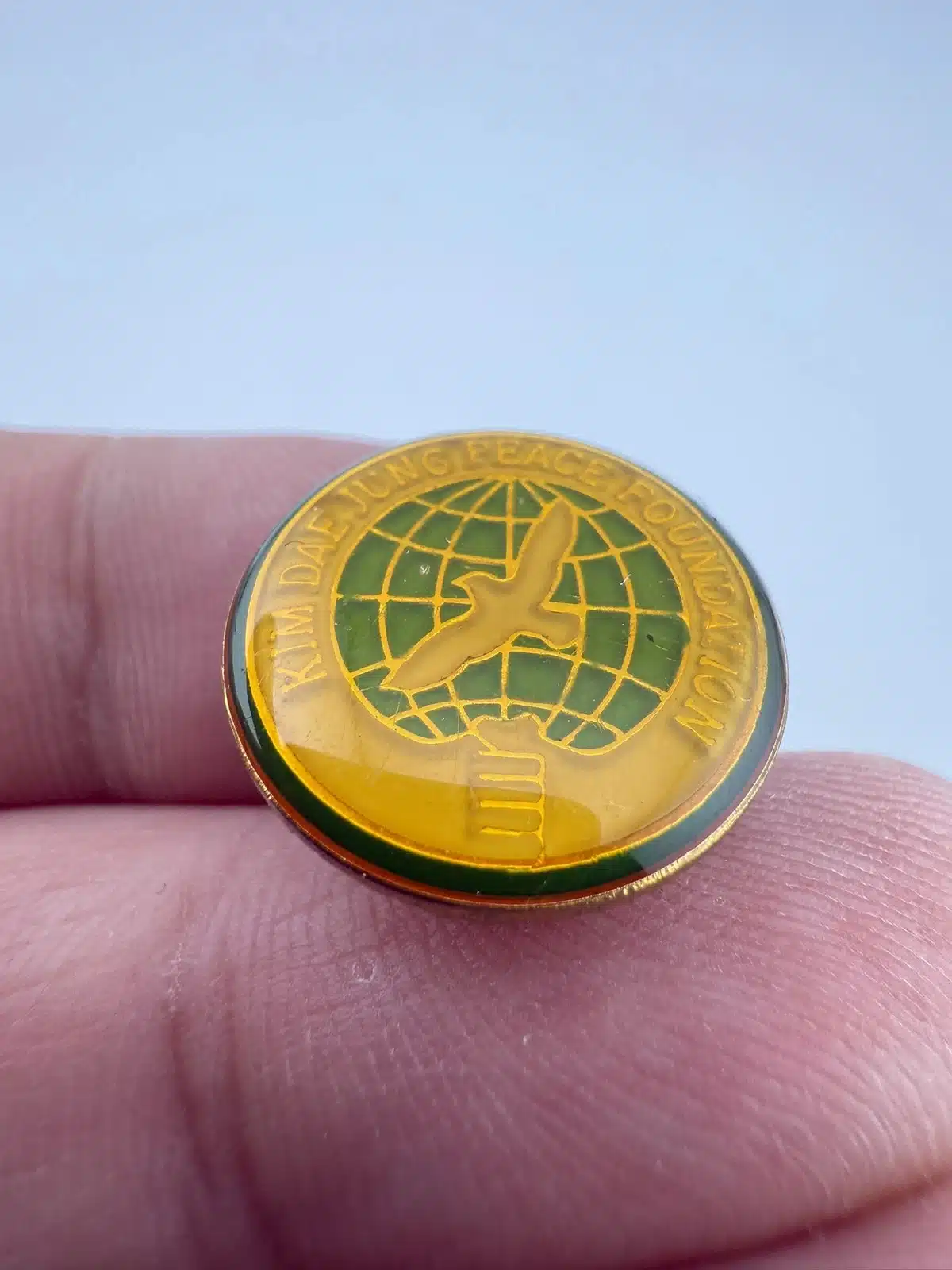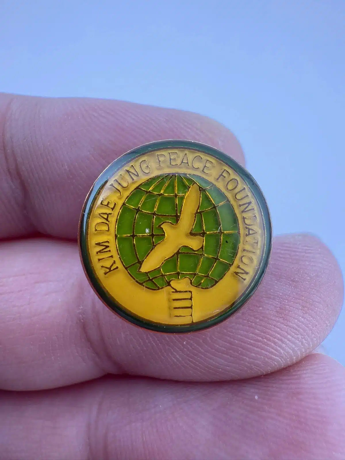 This pin features the logo of the Kim Dae Jung Peace Foundation, showcasing a globe and dove design that symbolizes peace and international cooperation.