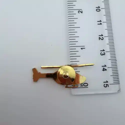 This gold tone pin is shaped like a helicopter and features a rainbow-style graphic along the lower portion with a large number 4 in gold tone incorporated into the design. The text KNBC-TV appears on the side of the helicopter just behind the door.