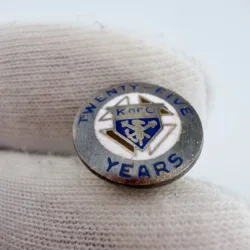 This sterling silver pin is circular and features the Knights of Columbus emblem at the center. At the top it reads “Twenty-Five,” and at the bottom it says “Years.”