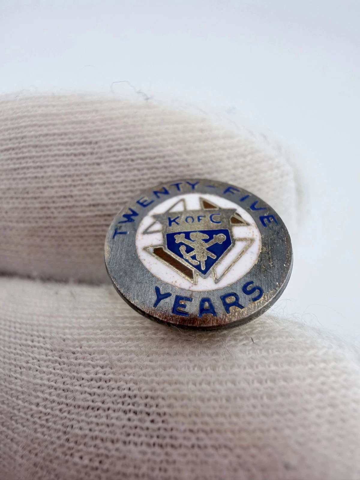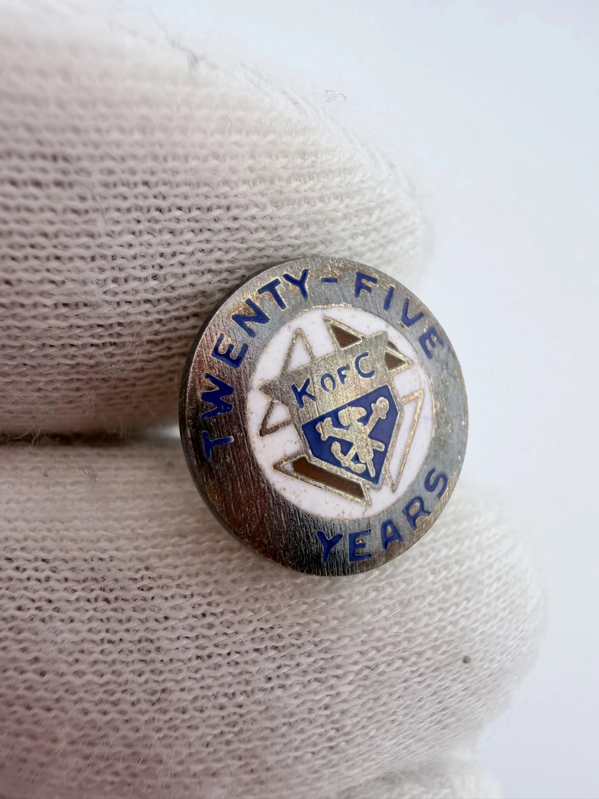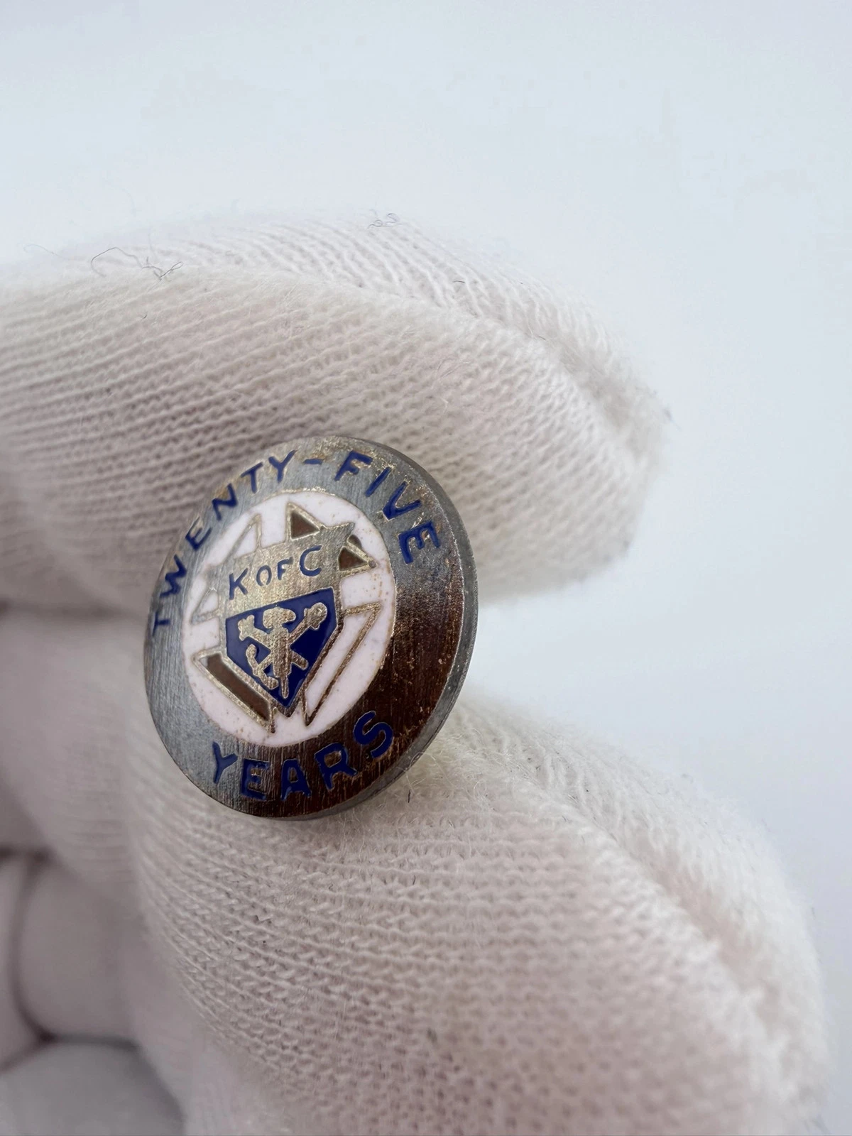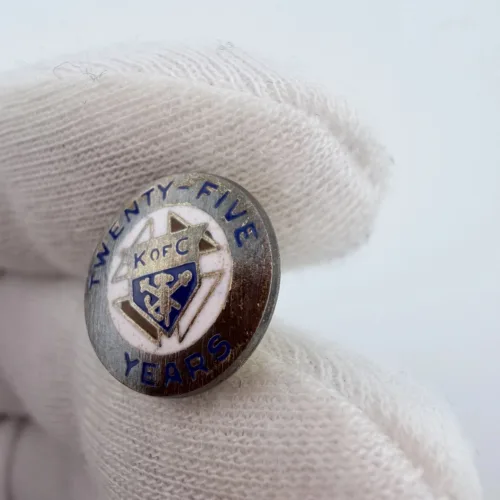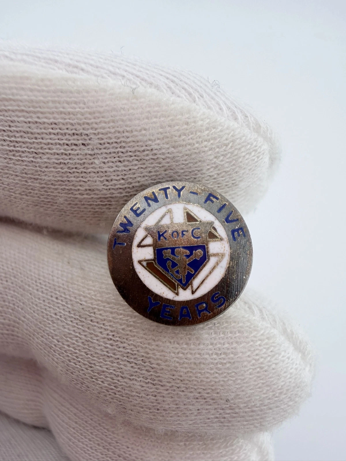 This sterling silver pin is circular and features the Knights of Columbus emblem at the center. At the top it reads “Twenty-Five,” and at the bottom it says “Years.”