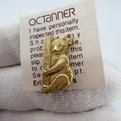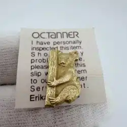This tie tack pin features an intricately detailed gold tone Koala, expertly crafted to depict the animal climbing up a tree or branch. Made from 1/10 10K gold-filled material by O.C. Tanner (cTo), it reflects the charm and uniqueness of Australian wildlife.