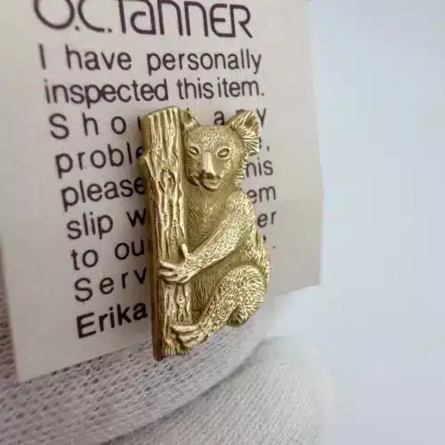 This tie tack pin features an intricately detailed gold tone Koala, expertly crafted to depict the animal climbing up a tree or branch. Made from 1/10 10K gold-filled material by O.C. Tanner (cTo), it reflects the charm and uniqueness of Australian wildlife.