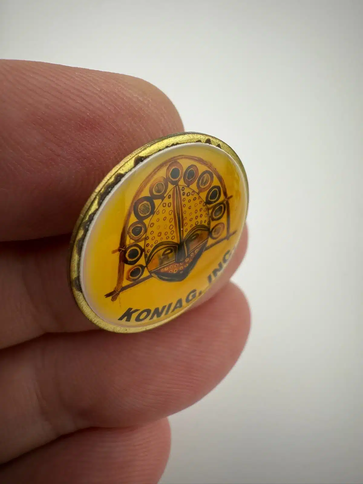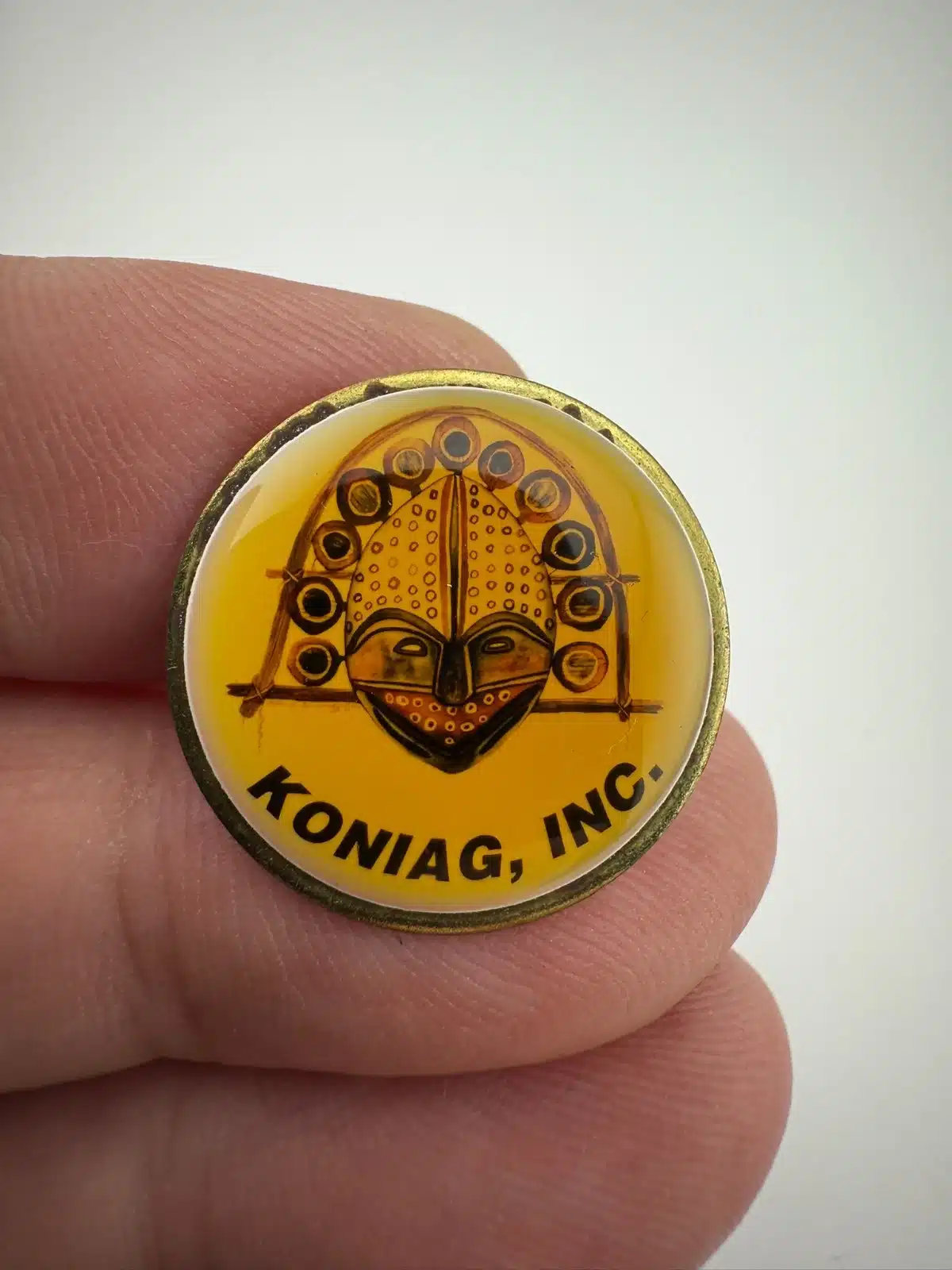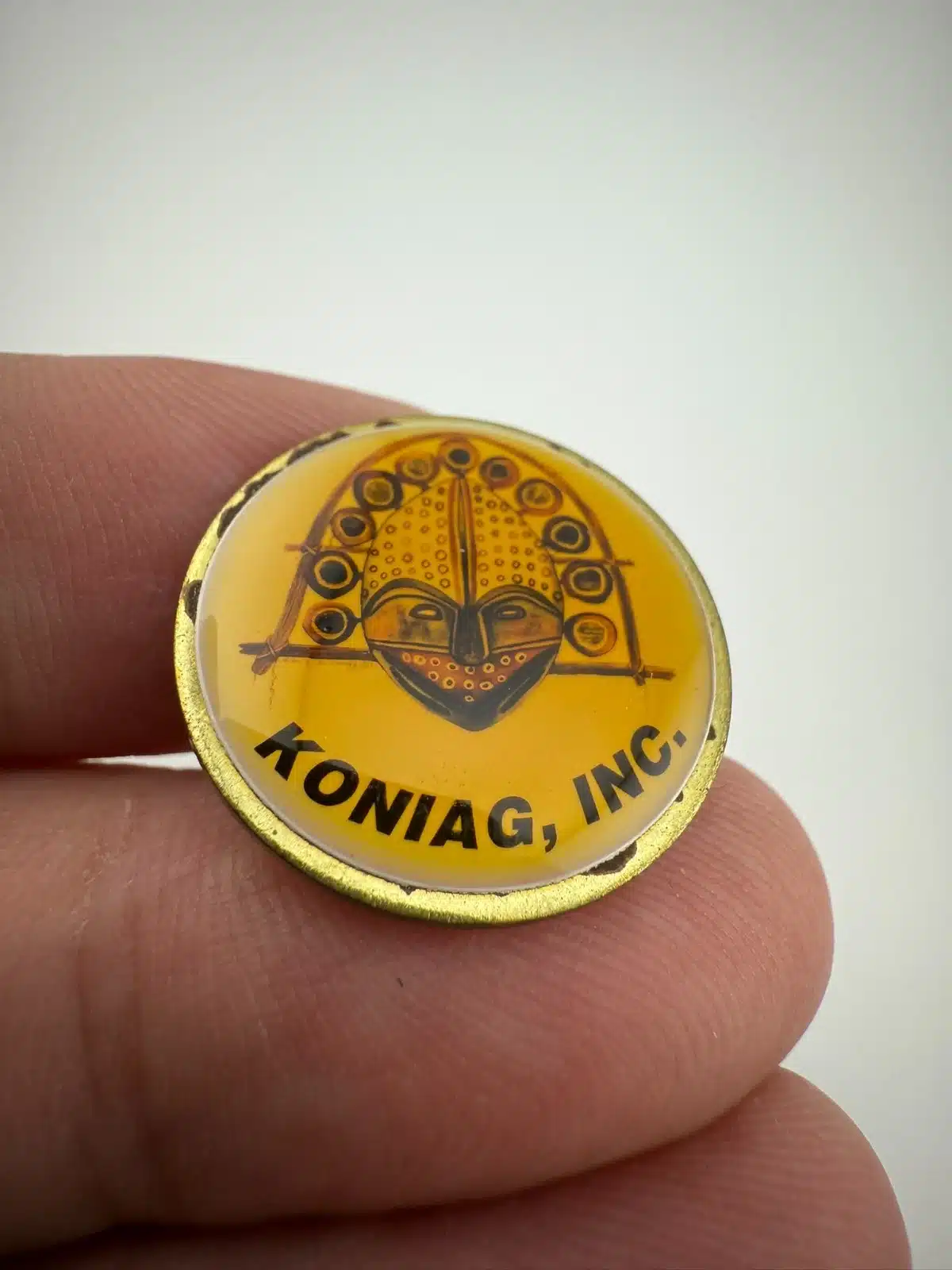Koniag, INC. is a regional Alaska native corporation that was established by Congress in 1971. This particular pin features a beautiful Eskimo bird mask.