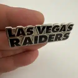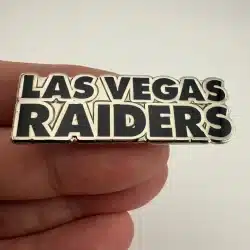 This pin features the Las Vegas Raiders name in black enamel with silver tone highlights, presented in a long horizontal layout. The design is clean and bold, reflecting the team’s modern branding.