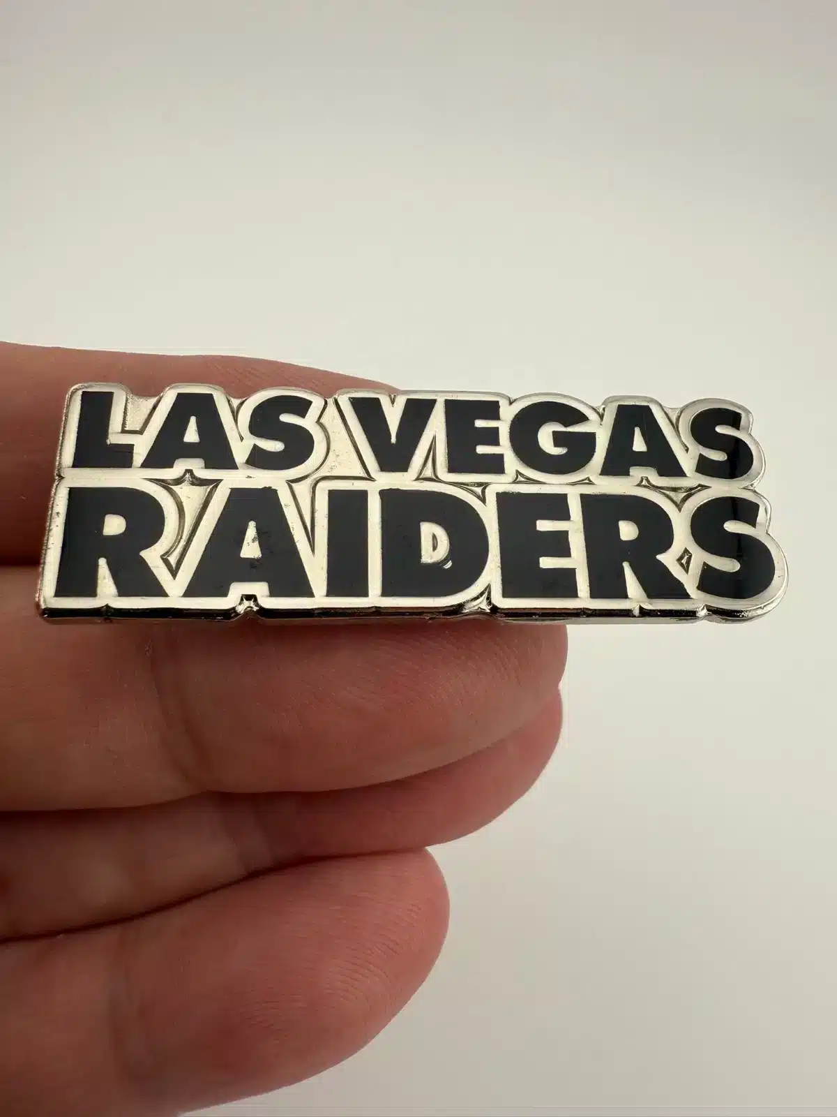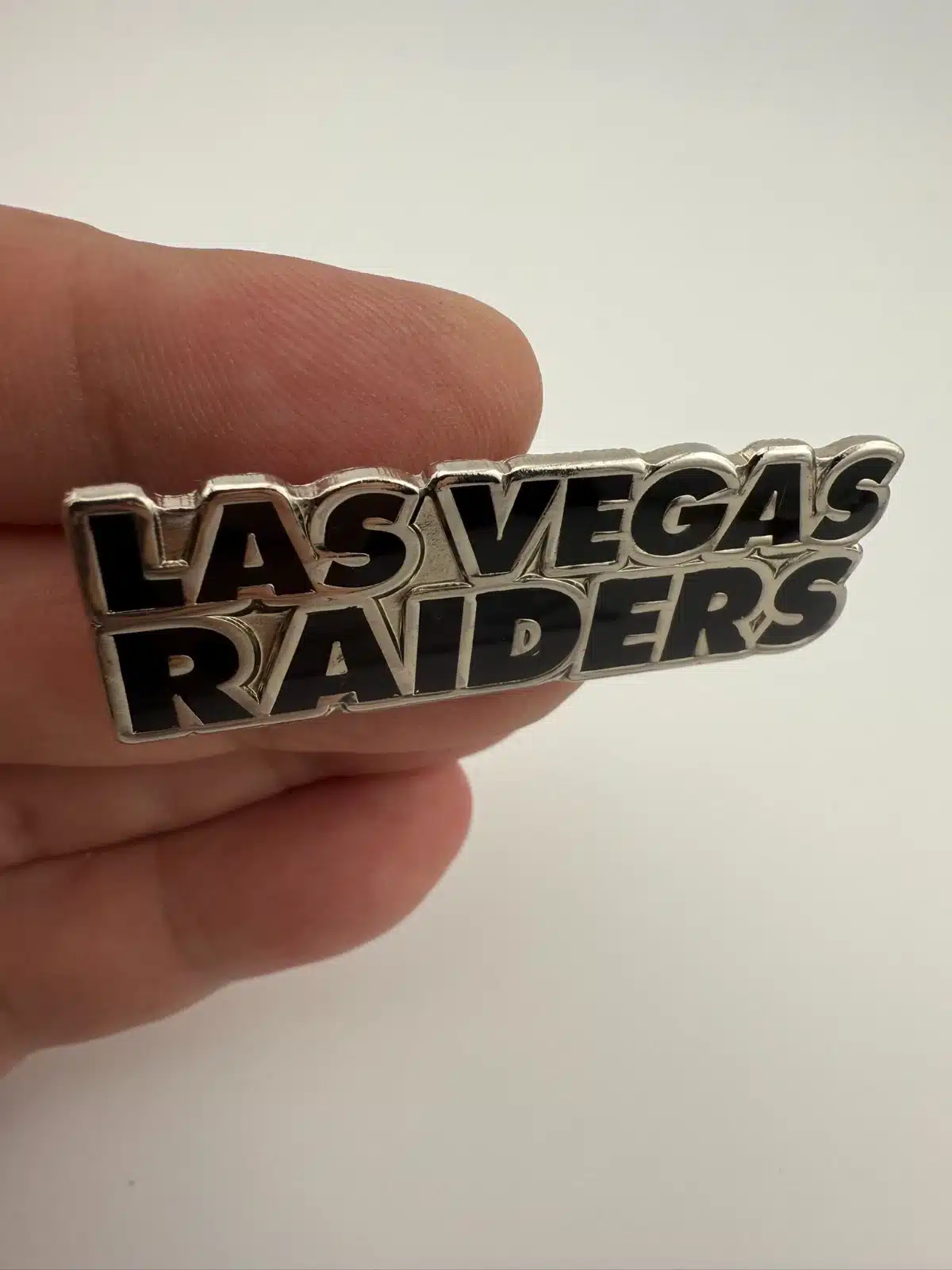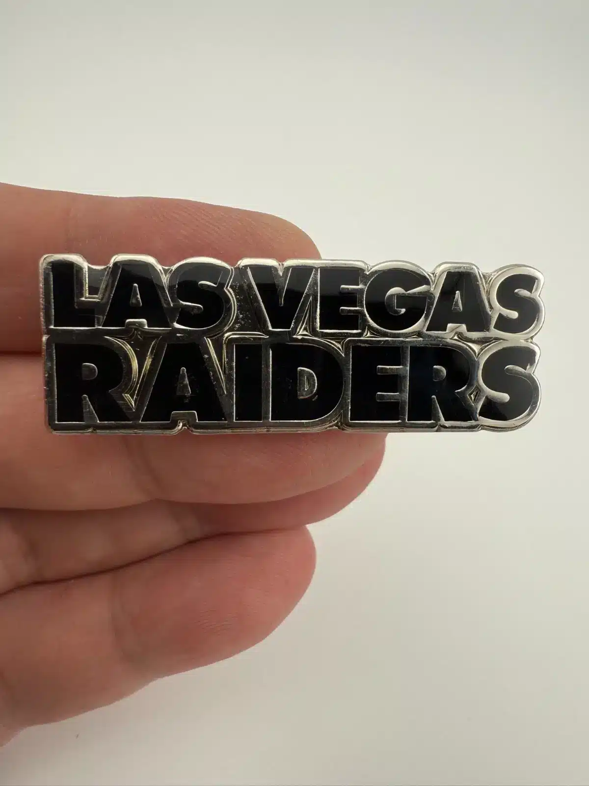 This pin features the Las Vegas Raiders name in black enamel with silver tone highlights, presented in a long horizontal layout. The design is clean and bold, reflecting the team’s modern branding.