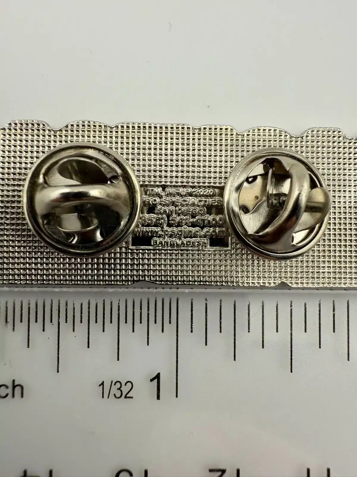 Manufactured by Pro Specialties Group (PSG) and copyrighted 2020, this piece corresponds with the Raiders’ move to Las Vegas and updated identity. Pin measures approximately 2 inches in width by about 3/4 inch in height and includes dual clasps.