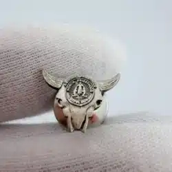 This sterling silver pin features a detailed oxen skull head, symbolizing strength and service, along with the text ‘Aaronic Priesthood Honor Priesthood Serve God’ emphasizes the commitment to faith and service within the LDS community.