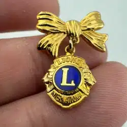 This pin brooch features a vibrant ribbon bow design along with a hanging charm that features the iconic Lions Club International emblem.