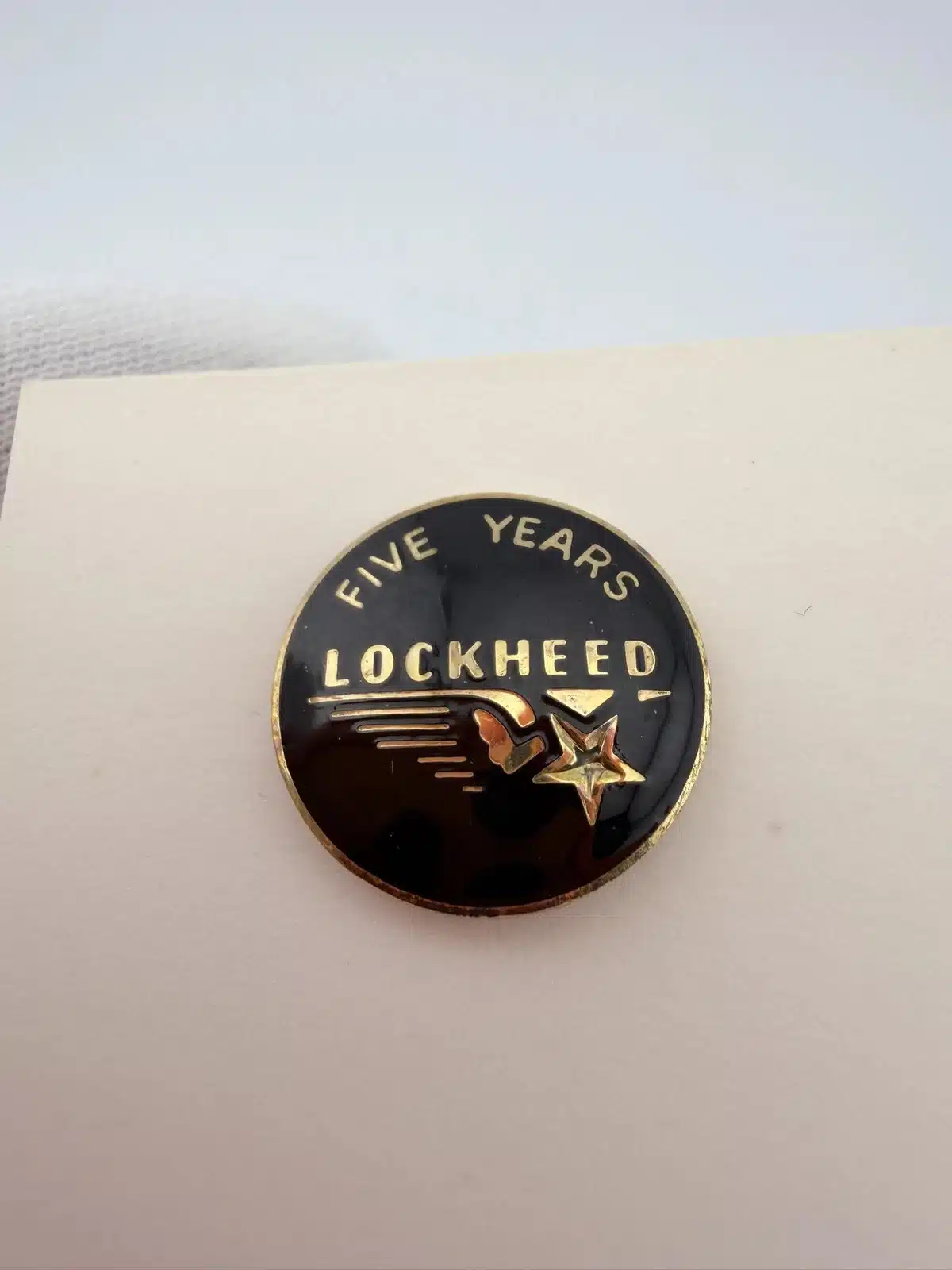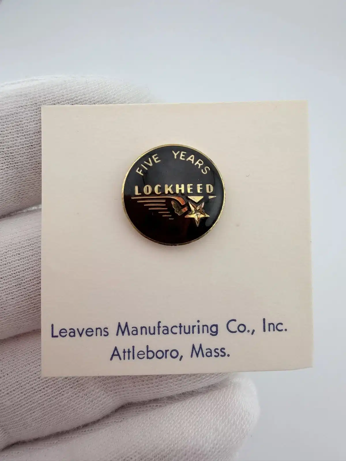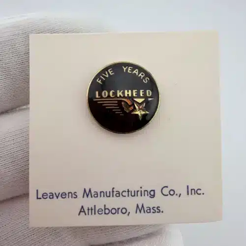 The screwback style rear is consistent with mid-20th century service pins, and the piece appears to be unused. The 5 year designation marks an early career milestone within Lockheed’s long history in the aerospace industry.