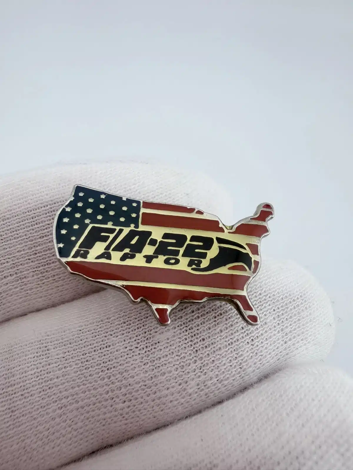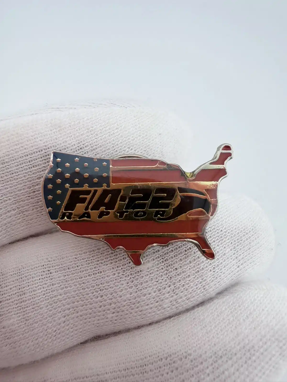 This pin features the silhouette of the United States, adorned with an overlay of the American flag, symbolizing national pride. Prominently displayed on top is the text F/A-22 Raptor, a cutting-edge stealth fighter jet known for its advanced technology and capabilities.
