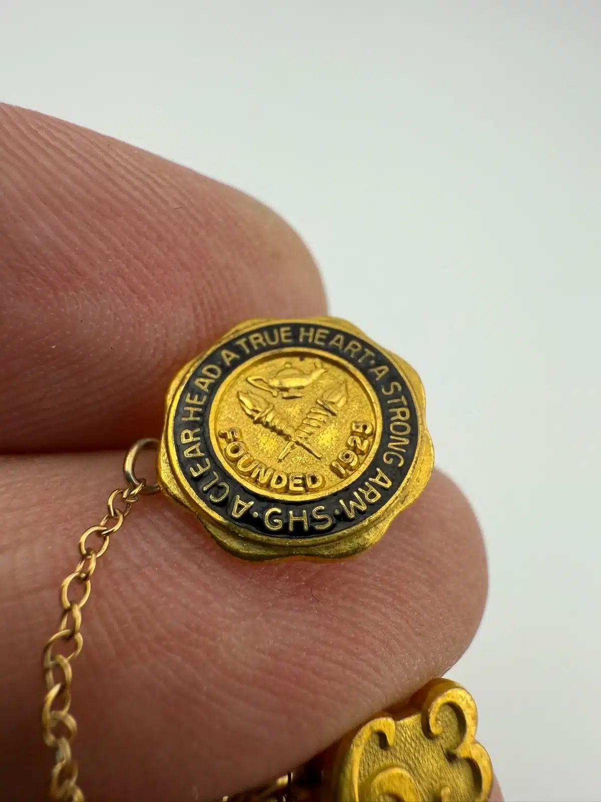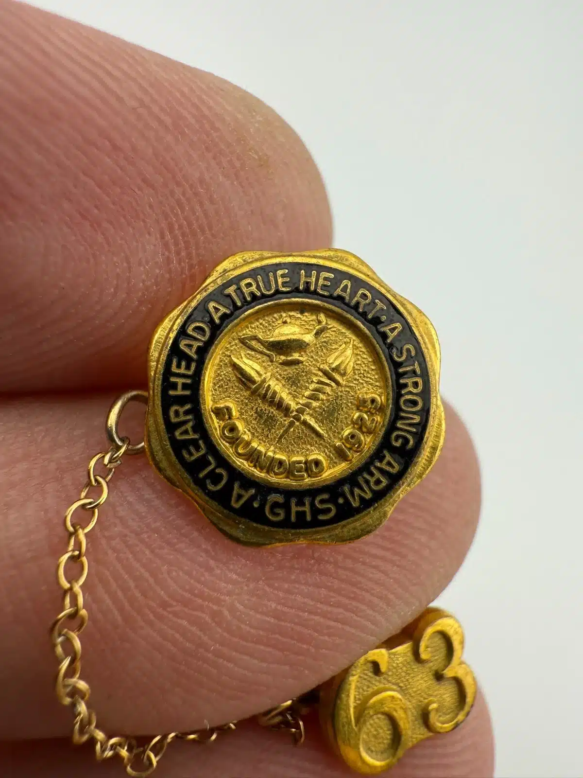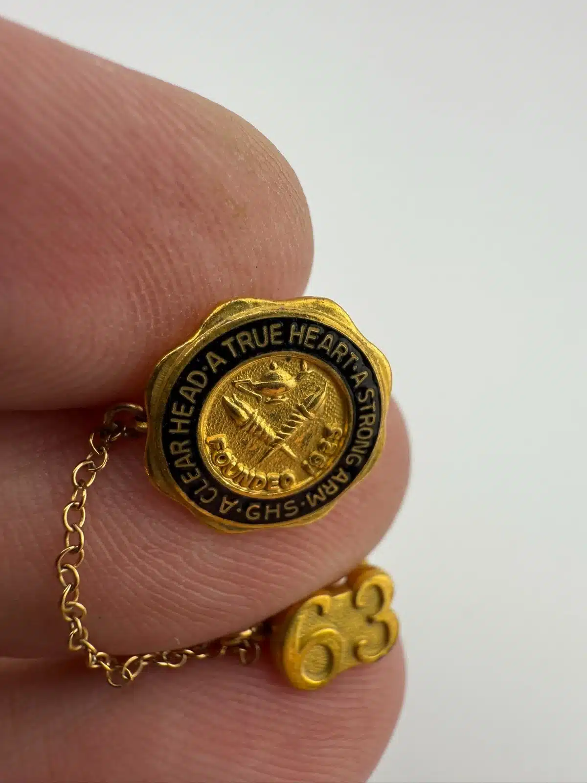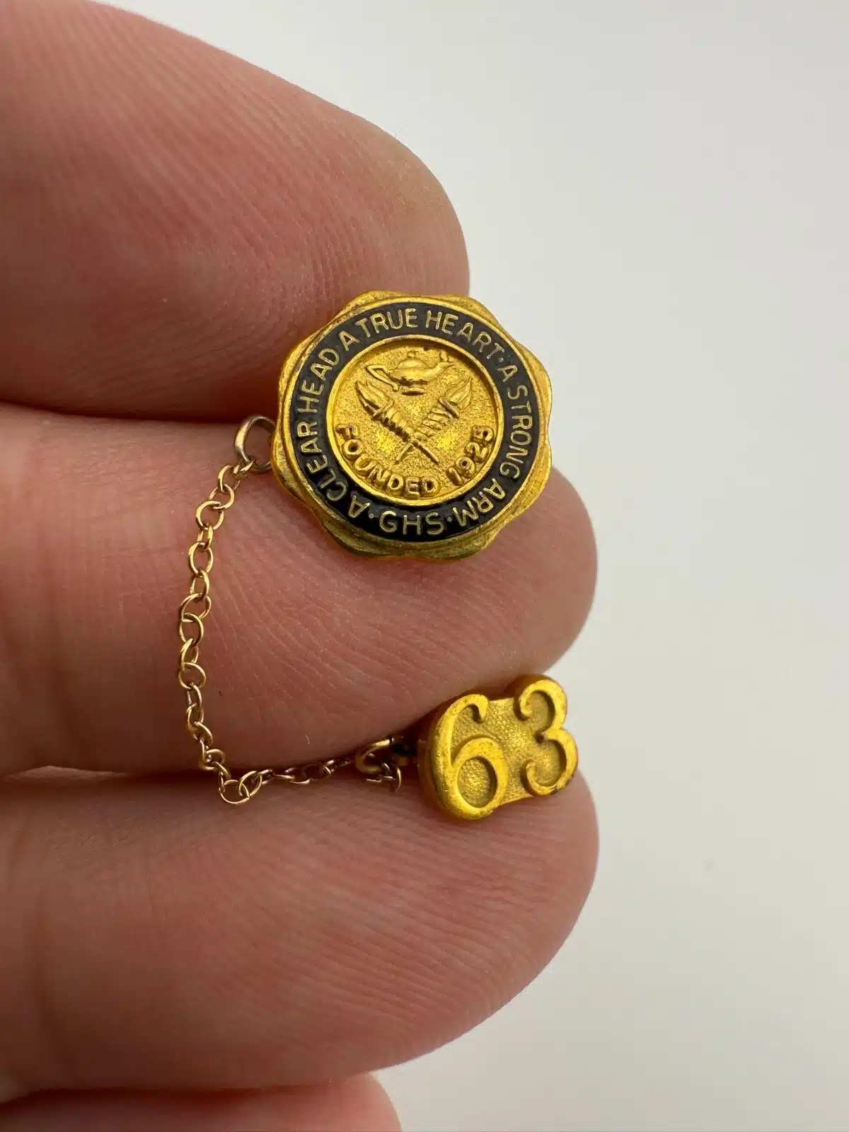 James A. Garfield Senior High School in Los Angeles, California pin featuring the school motto and an attached 1963 graduation year pin on chain.
