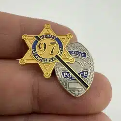 Los Angeles County Sheriff and Police Office badge pin with a black mourning bar. Unfortunately I do not have any specific details about what this pin was for. Possibly the 97 is in reference to 1997.