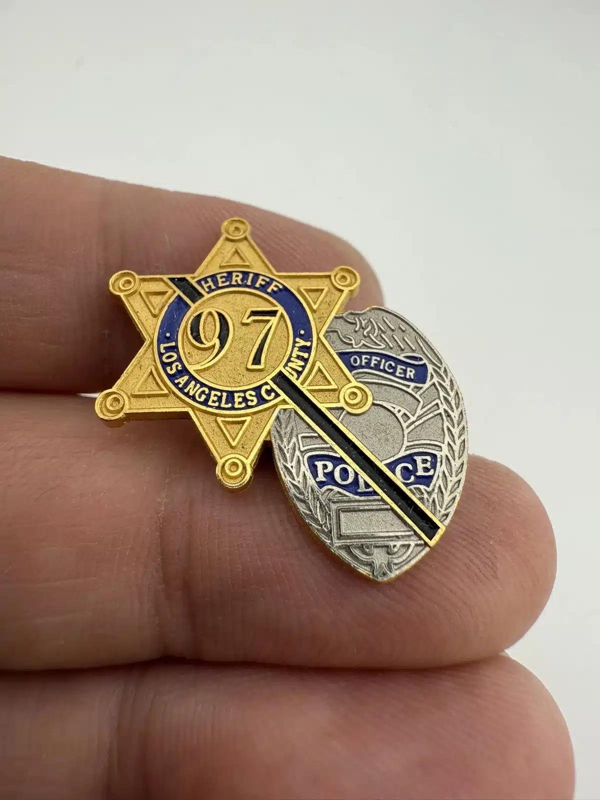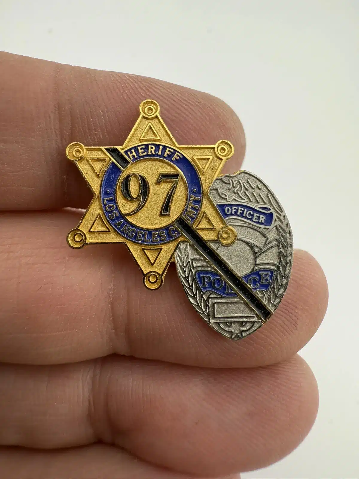 Los Angeles County Sheriff and Police Office badge pin with a black mourning bar. Unfortunately I do not have any specific details about what this pin was for. Possibly the 97 is in reference to 1997.
