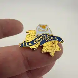 This pin features the emblem of the Los Angeles County Professional Peace Officers Association. The logo is comprised of an eagle, police badge with a bear on top, and a sheriff’s badge.