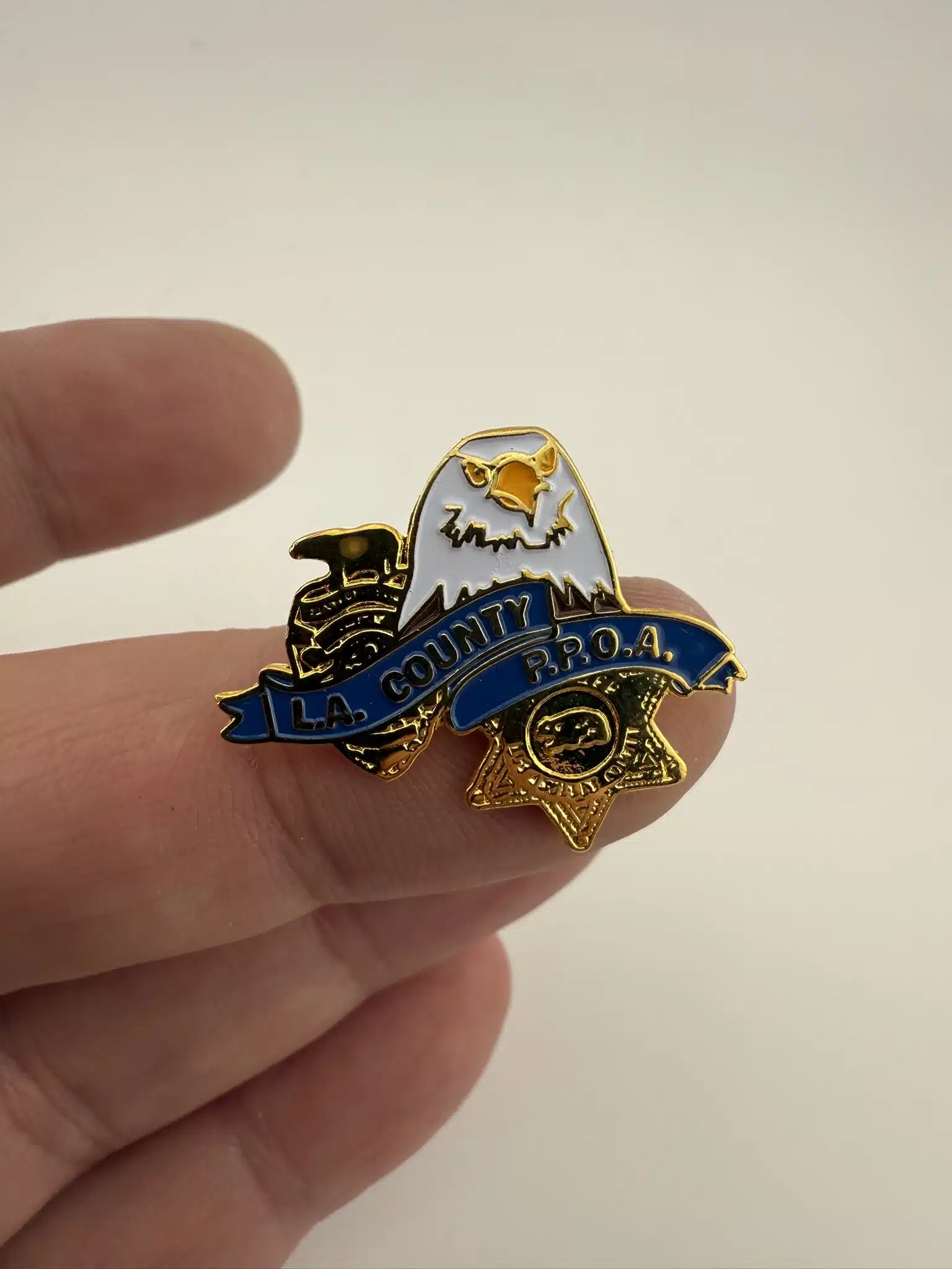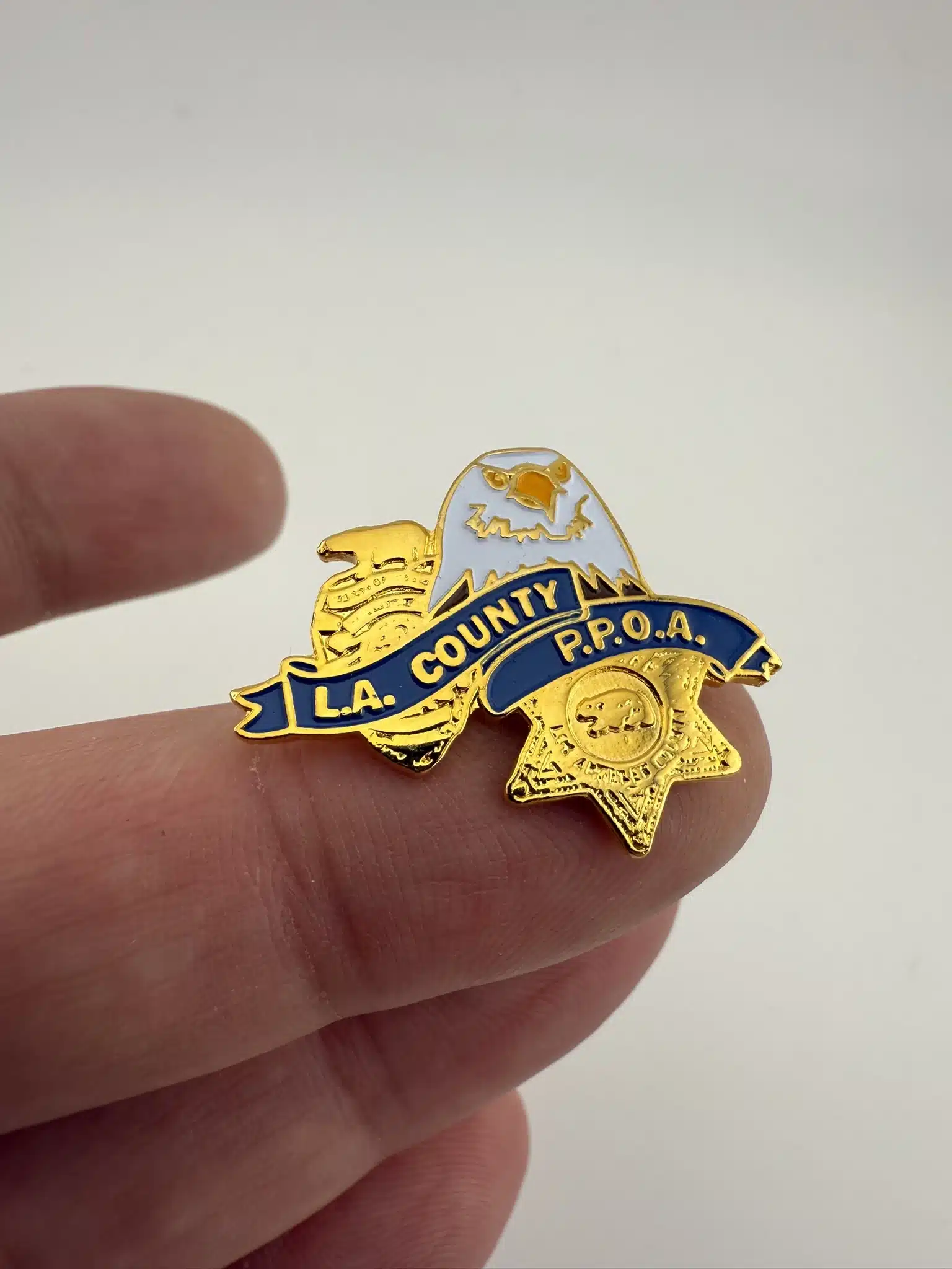 This pin features the emblem of the Los Angeles County Professional Peace Officers Association. The logo is comprised of an eagle, police badge with a bear on top, and a sheriff’s badge.