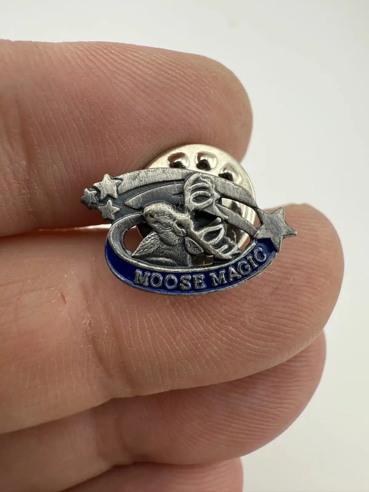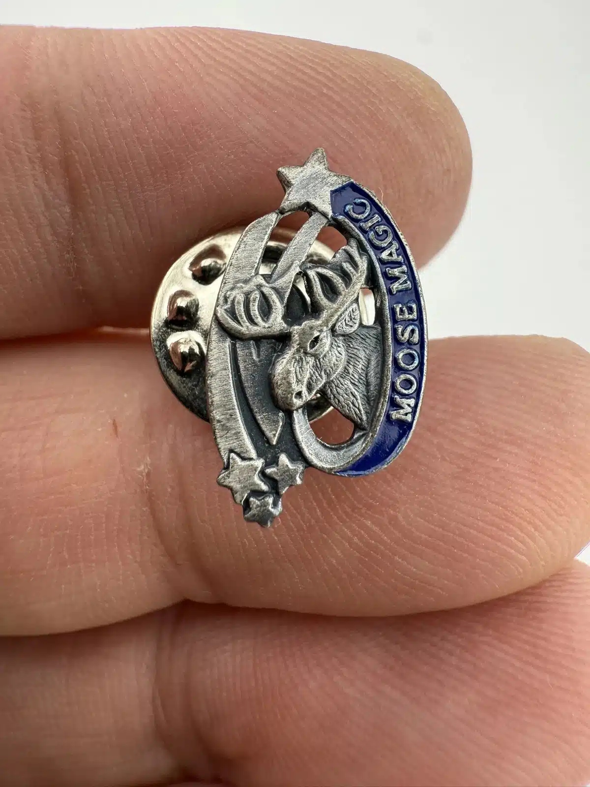 Fun Moose Magic lapel hat pin from the Loyal Order Of Moose fraternity. Features blue enamel, a moose with impressive antlers, and a couple of shooting stars.