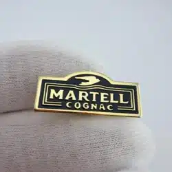 This Martell Cognac logo pin features a gold tone dove emblem set against a dark background that carries subtle deep purple and deep blue tones. The rich contrast between the metallic finish and the darker enamel creates a refined, elegant look consistent with the heritage of the brand.