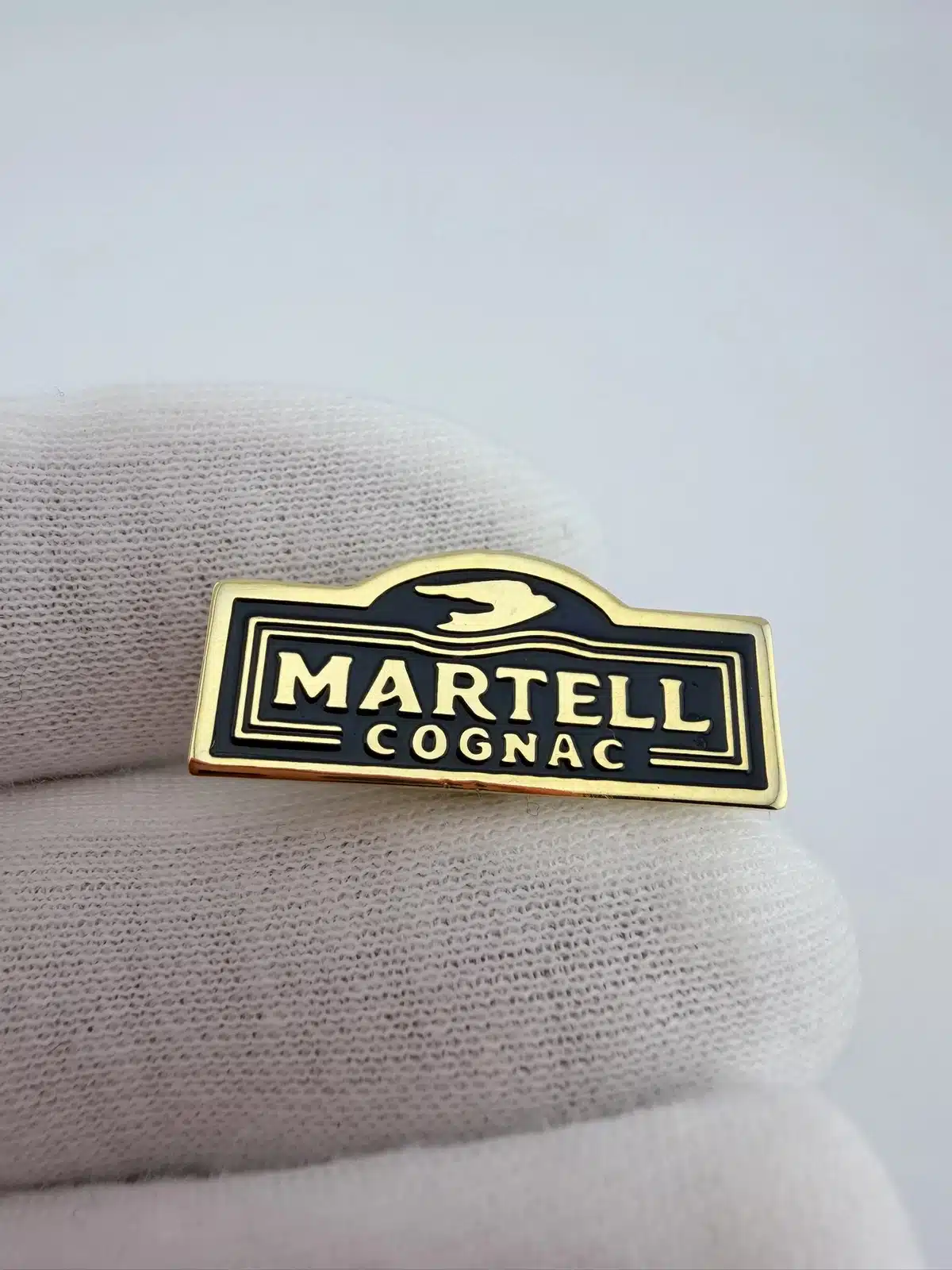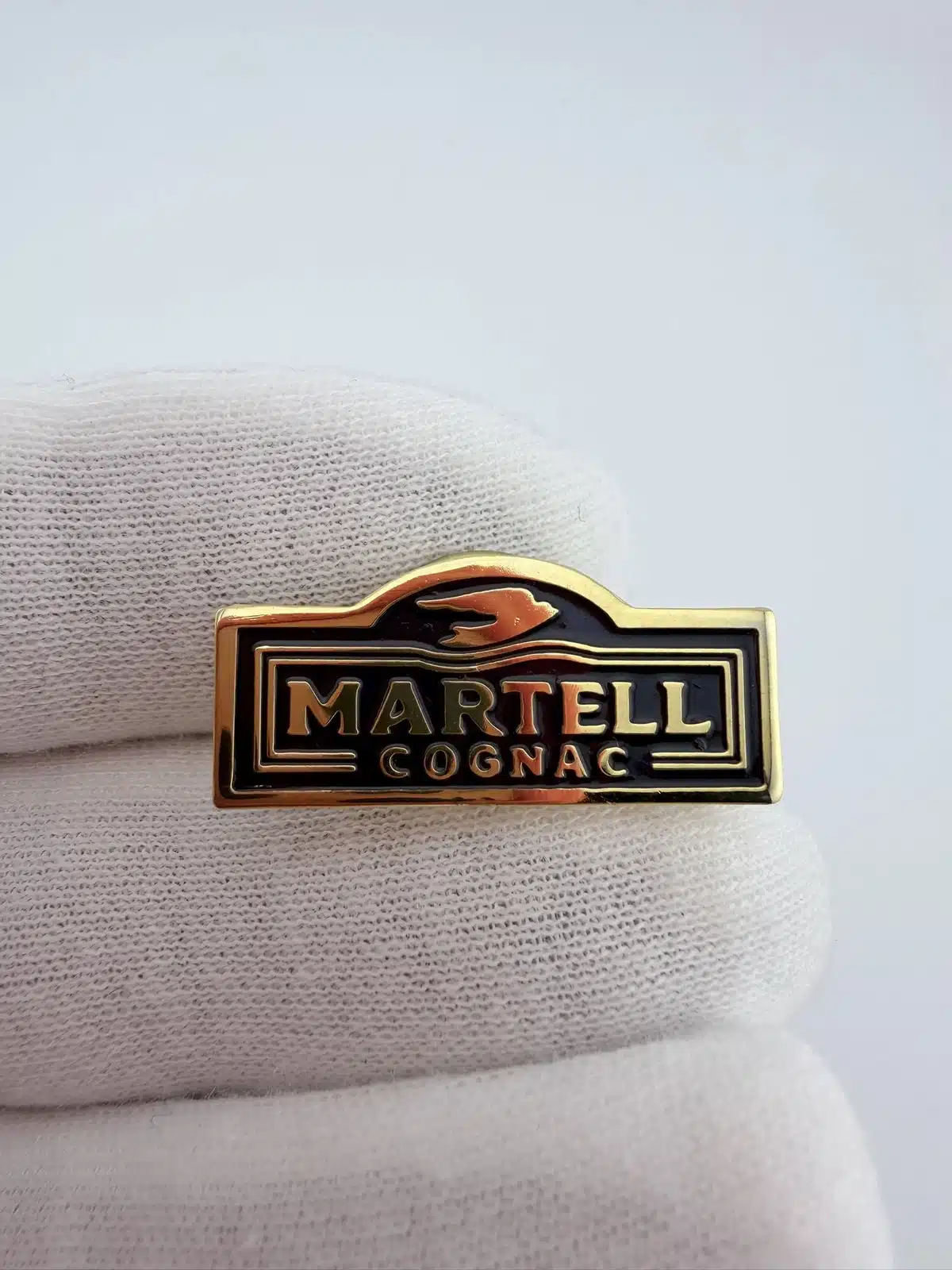 This Martell Cognac logo pin features a gold tone dove emblem set against a dark background that carries subtle deep purple and deep blue tones. The rich contrast between the metallic finish and the darker enamel creates a refined, elegant look consistent with the heritage of the brand.